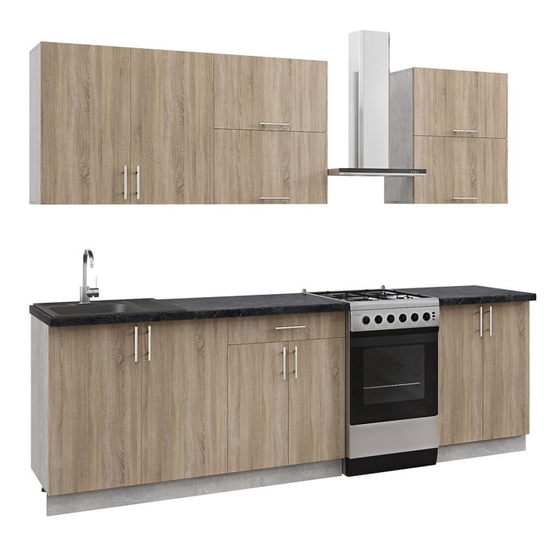 Kitchen composition--- We present to you the new series of furniture-compositions for the kitchen that we have added to our range. This composition is in a large dimension in SONOMA dark color. The wall cabinets consist of 1 double cabinet and 4 cabinets with doors that open horizontally. The floor unit consists of 1 double cabinet under the single sink, a long drawer, and another double cabinet below, and finally another double cabinet at the end. All cabinet doors have modern ΙΝΟΧ handles. The countertops of the composition have the color and appearance of black marble and create a beautiful two-tone coloring, while their construction material allows you to use them comfortably because they are resistant to various types of stress.