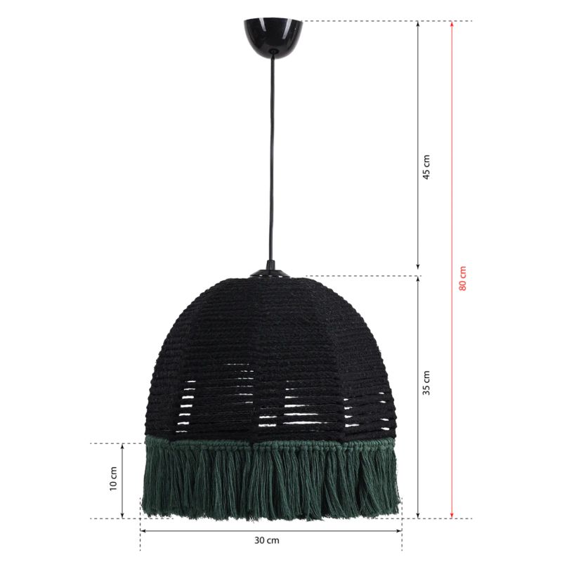 FB97654.01- Ceiling pendant----If you want to decorate your space with a lamp in boho style, this is the right choice. It is a single-light lamp with a bell-shaped "cap" made of BLACK thin knitted rope, of high quality and durable. The special feature of this lamp, however, is that the "cap" ends in CYPRESS GREEN colored fringes, giving a different feel to the space.