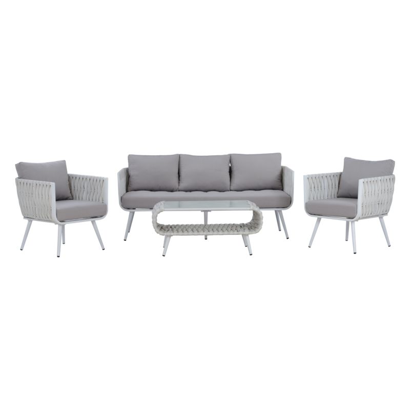 OUTDOOR LOUNGE SET 4PCS VARNAMO HM5282.12 ALUMINUM IN WHITE-STRAP ROPE IN GREY-TEMPERED GLASS