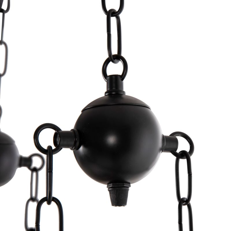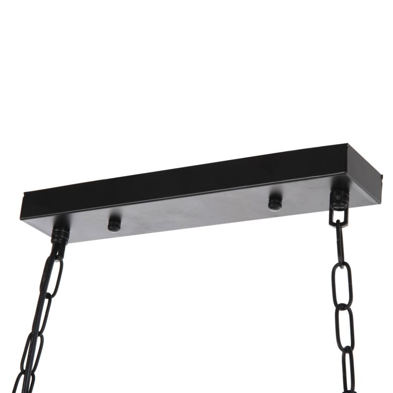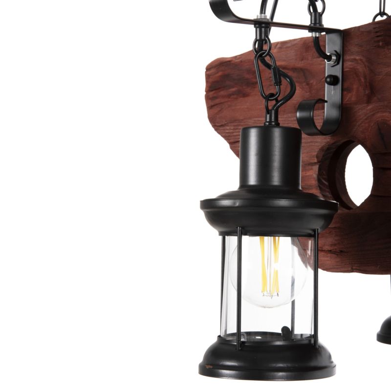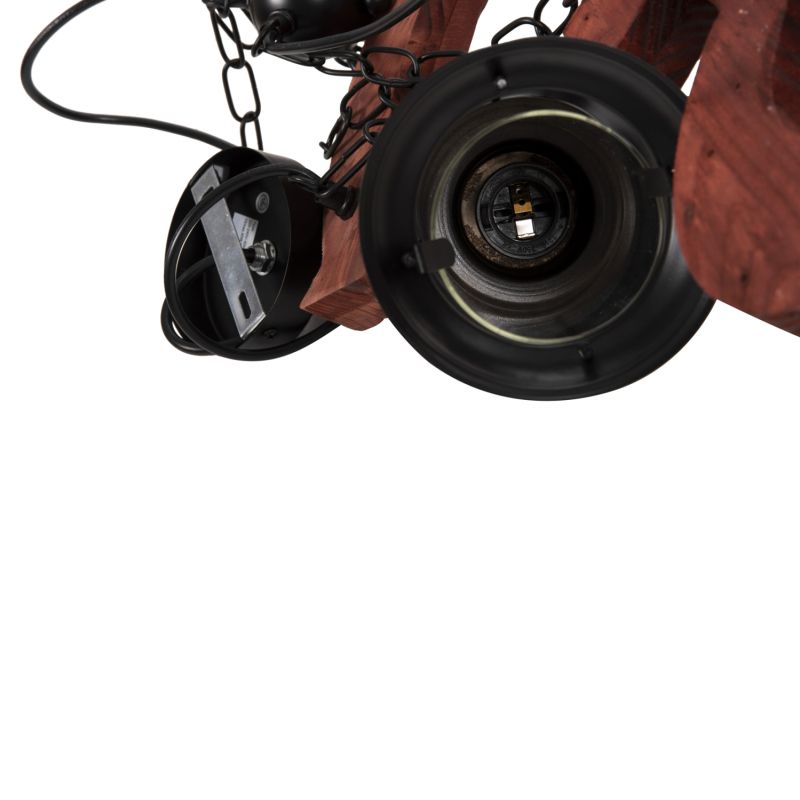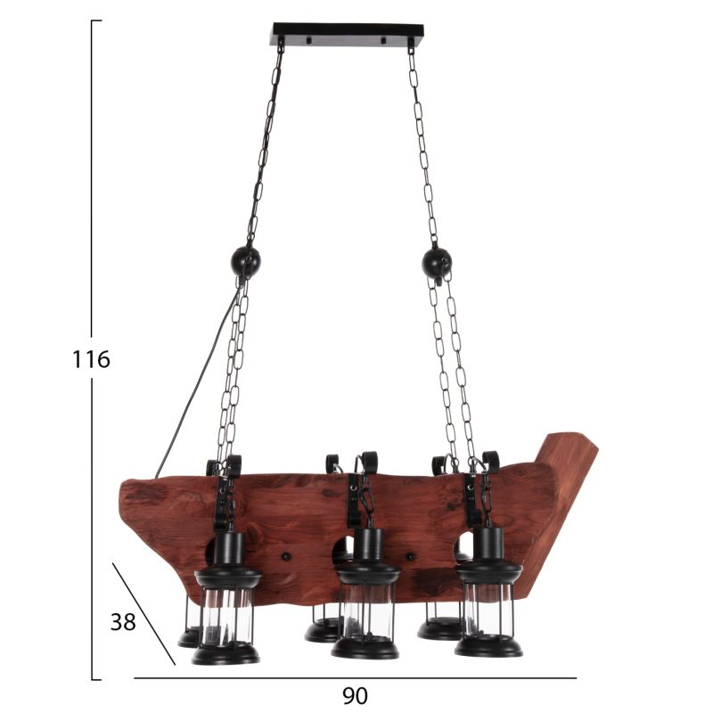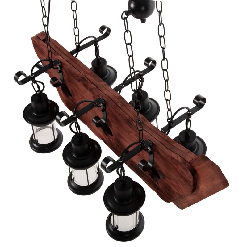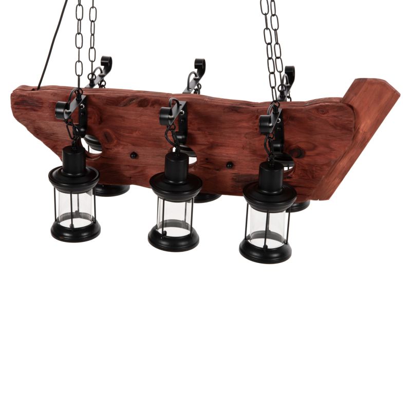 Discover the impressive 6-light ceiling fixture HM4117. A fixture that will be the center of attention thanks to its impressive and inspiring design. The 6 lanterns containing the bulbs hang with beautiful metal hangers from a wooden ship-shaped plate, which in turn hangs from the ceiling with chains.