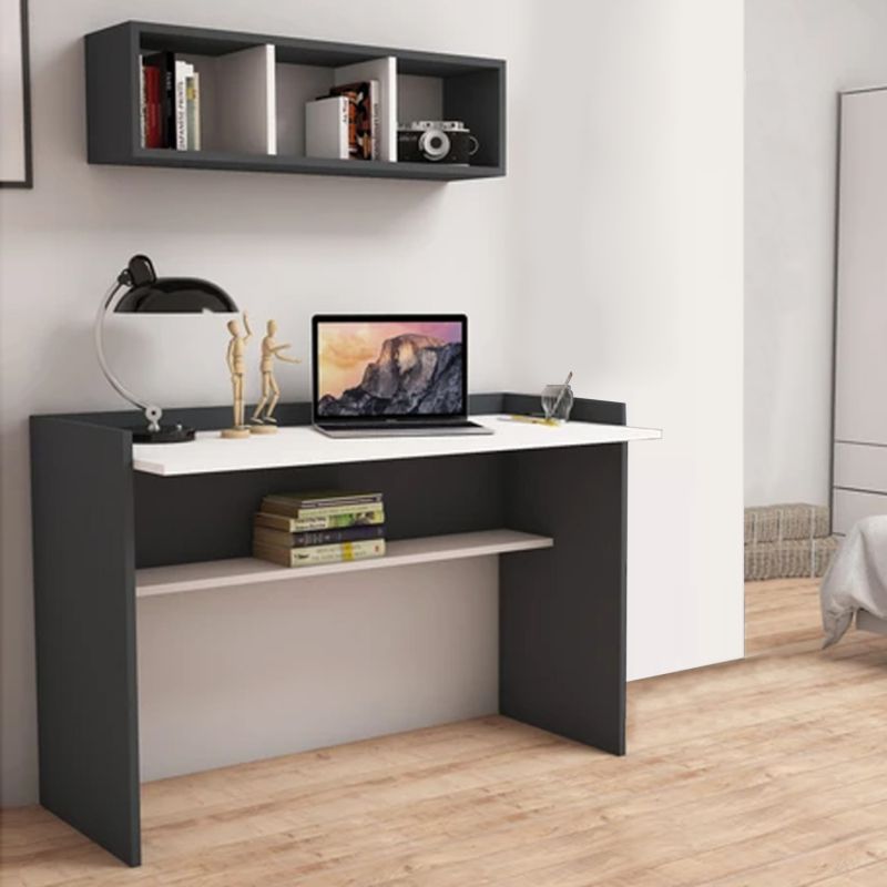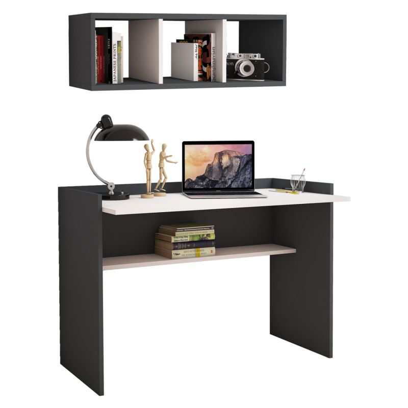 Office set with an elegant and simple design, consisting of a desk and a wall shelf, made of durable 18 mm thick high-quality melamine, in a grey and white shade.