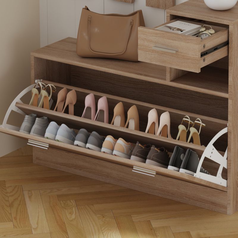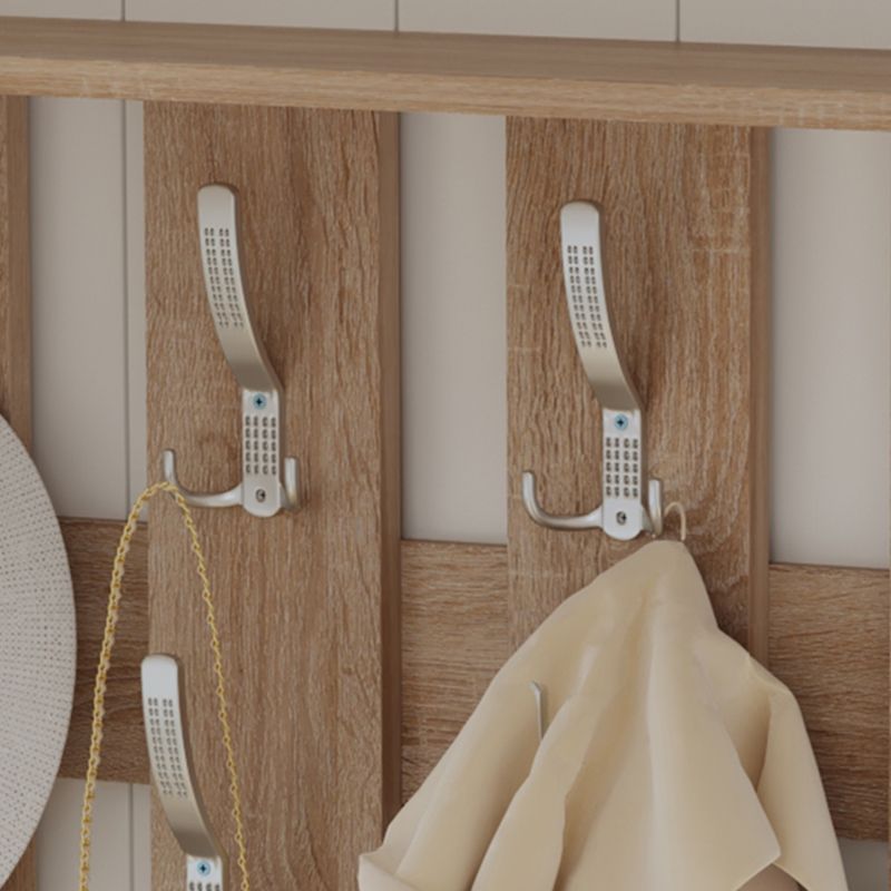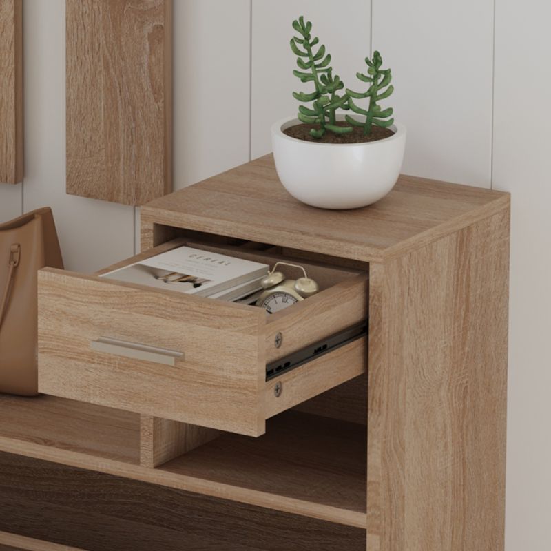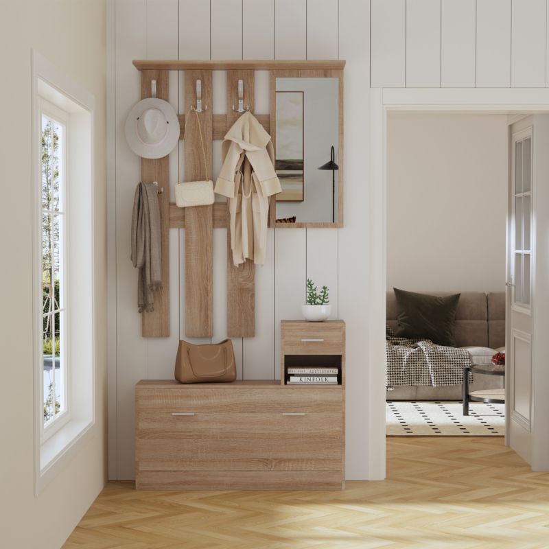 The entryway furniture GORN consists of a shoe cabinet with two doors and a small open storage space and a drawer on top. Above the shoe rack, and hanging on the wall, there is a structure with coat hangers and a mirror, while there is also a shelf at the very top. A melamine set in SONAMA color that will delight you with its practicality.