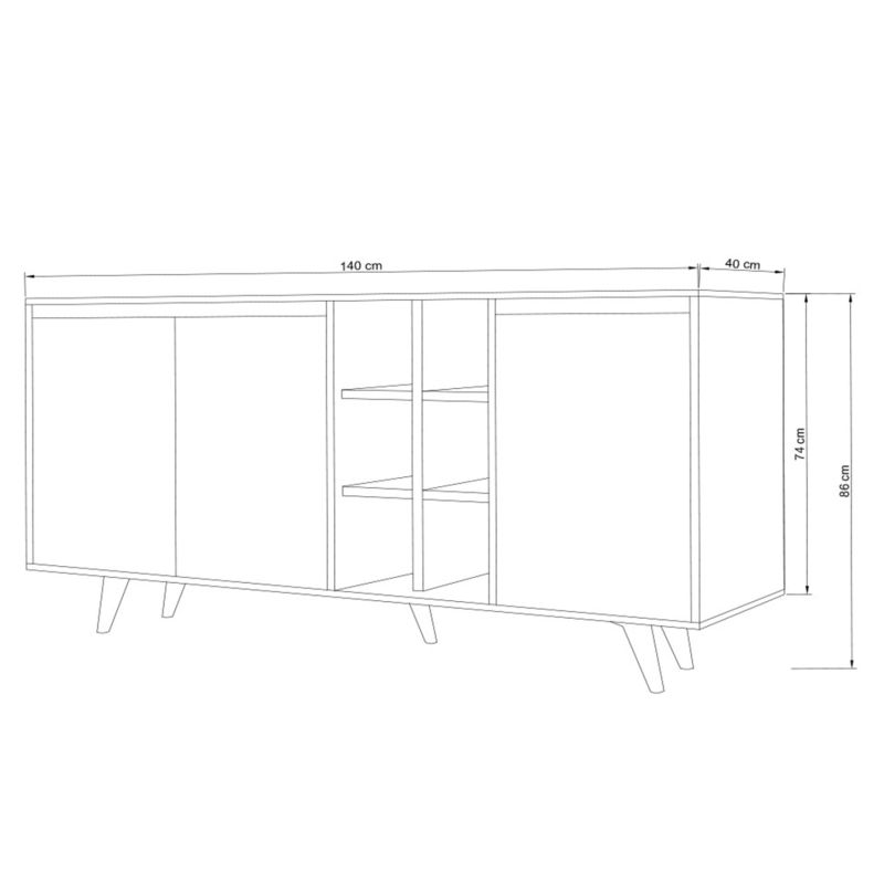 The buffet is made of melamine 18mm thick. Melamine is a type of wood in chipboard form. Chipboards are products that have the form of a panel and come from the welding, through pressing, of small pieces of wood (usually fir, beech, spruce, etc.) with the help of various resinous liquids. The chipboard is then coated, usually with synthetic materials such as hard paper sheets (melamines). As a material it is very durable and with great hardness. So, it is a synthetic material with a very hard surface, making it very resistant to scratches, abrasion, and stains.