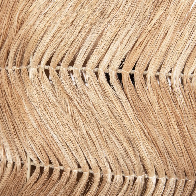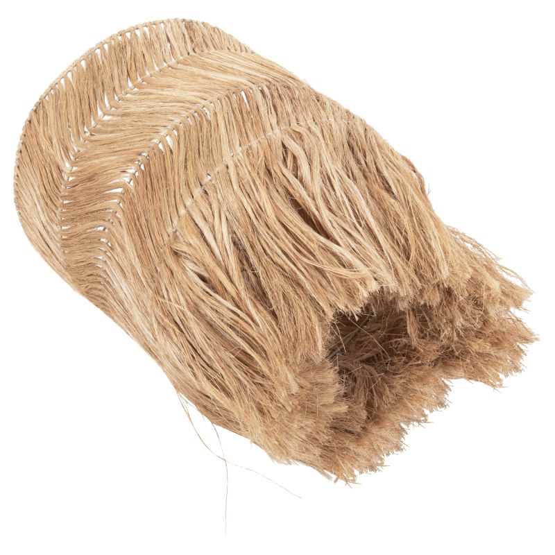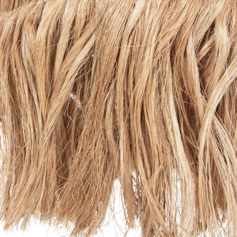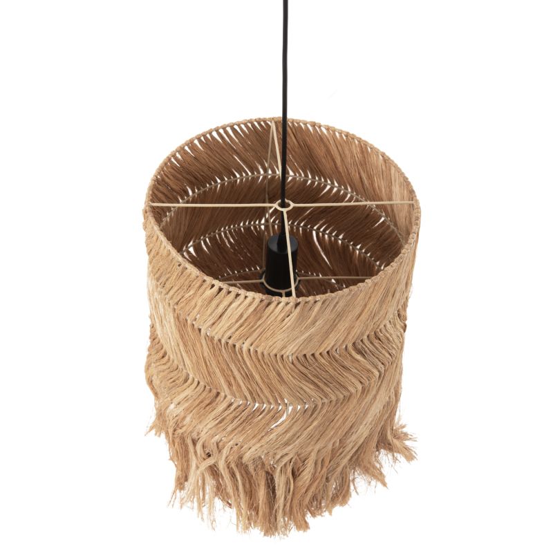 Hm7756- Ceiling pendant----If you want to decorate your space with a lamp in boho style, this is the right choice. It is a single-light lamp, with an oblong cylindrical "cap" made of abaca fibers in natural color (blond), in three rows with the fibers in opposite direction on each row. The special feature of this lamp, however, is that a big part of the "cap" consists of fringes, further enhancing the boho style.
