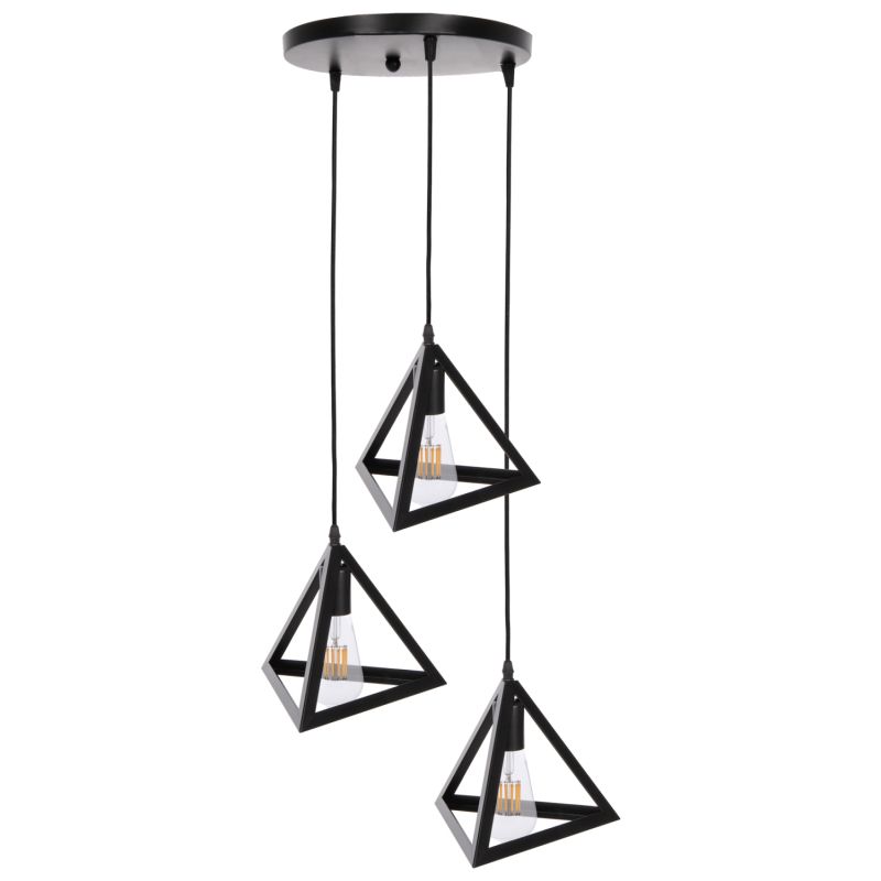 Discover our new pendant ceiling light and complete your decoration. It is a lamp with 3 BLACK metal pyramid-shaped caps, and it represents the latest trend in ceiling lamps.
