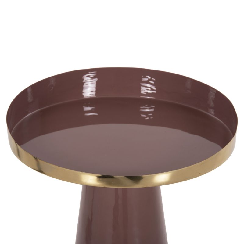 The LATUR side table is one of the new additions to our range. It is a round metallic table with a cone-shaped base. Its color is BROWNISH RED throughout with GOLD tabletop perimeter. The peculiarity of this table is that the perimeter of the tabletop is raised in an uneven way, giving the impression of a plate. Ideal for both home and business premises.