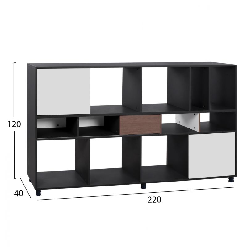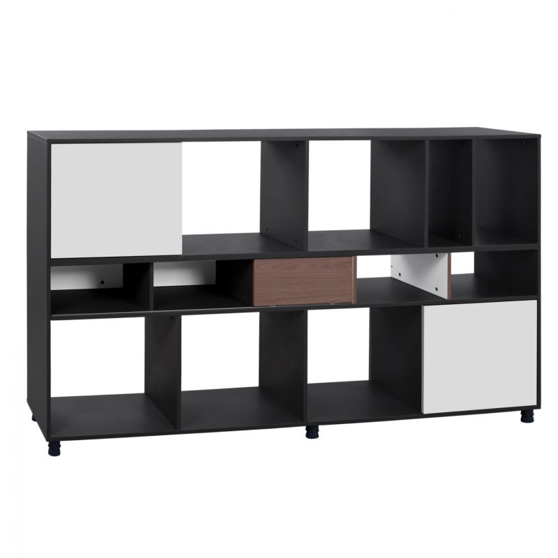 It has two cabinets, one sliding door for three consecutive shelves and nine open storage spaces.