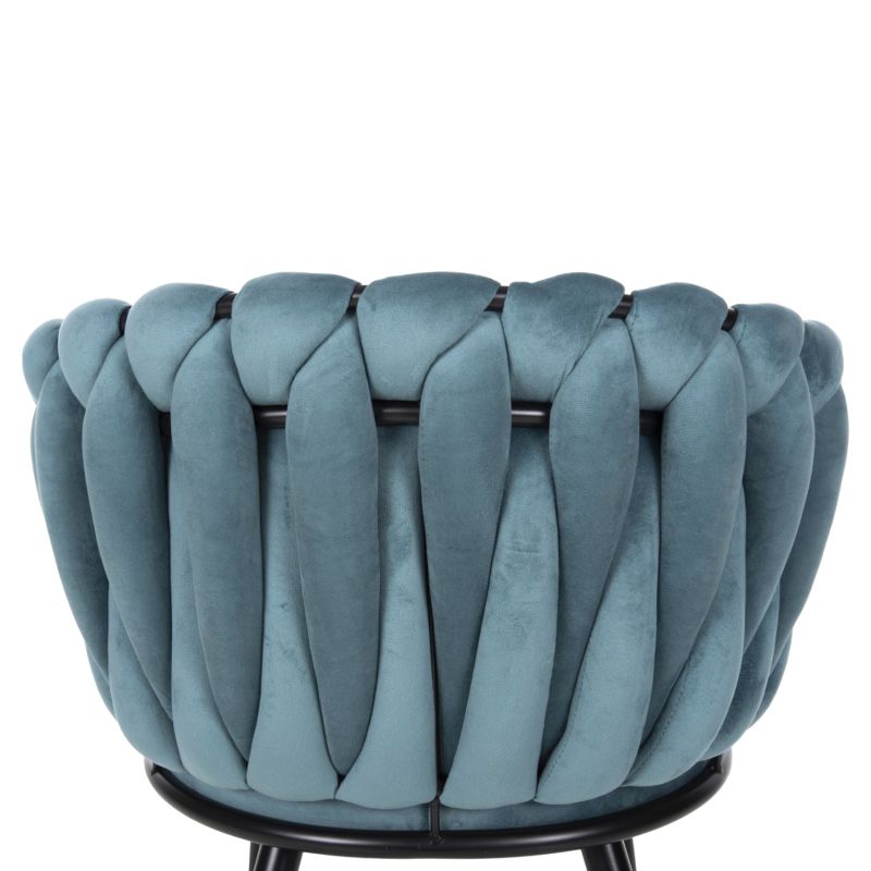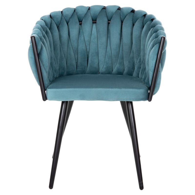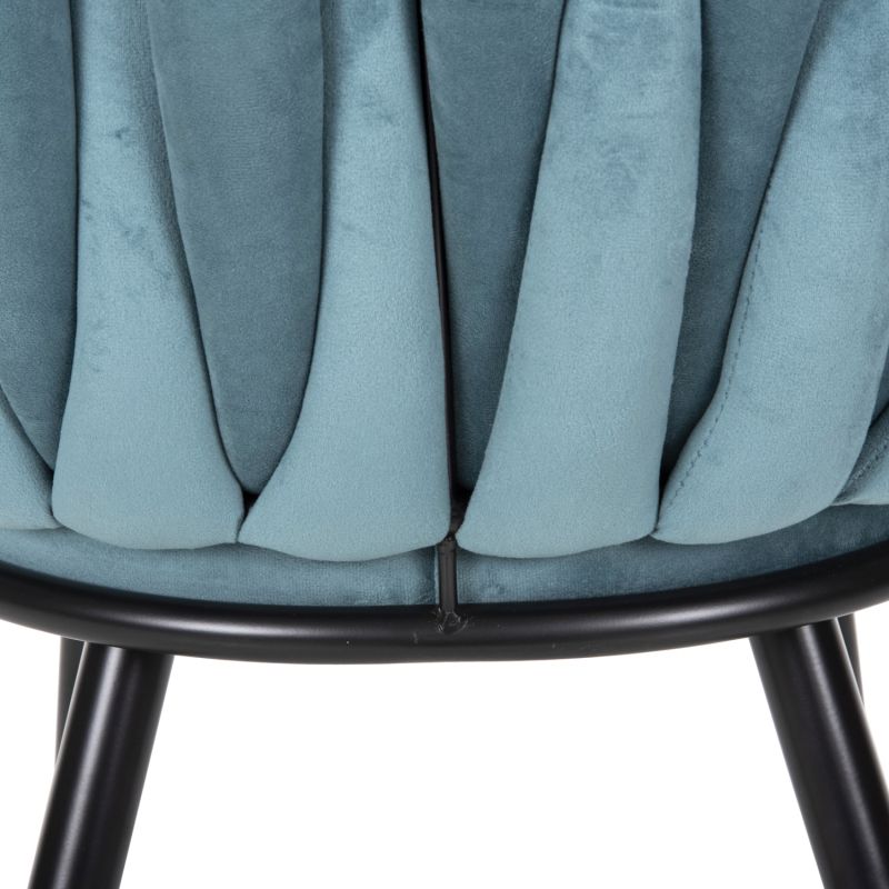 LUANDA is a chair with TURQUOISE velvet fabric and BLACK metal legs, which has everything you want from such a piece of furniture. It has a semi-circular back, while the back consists of wide foam rope woven onto the metal frame and is sure to be the center of attention wherever it is placed.