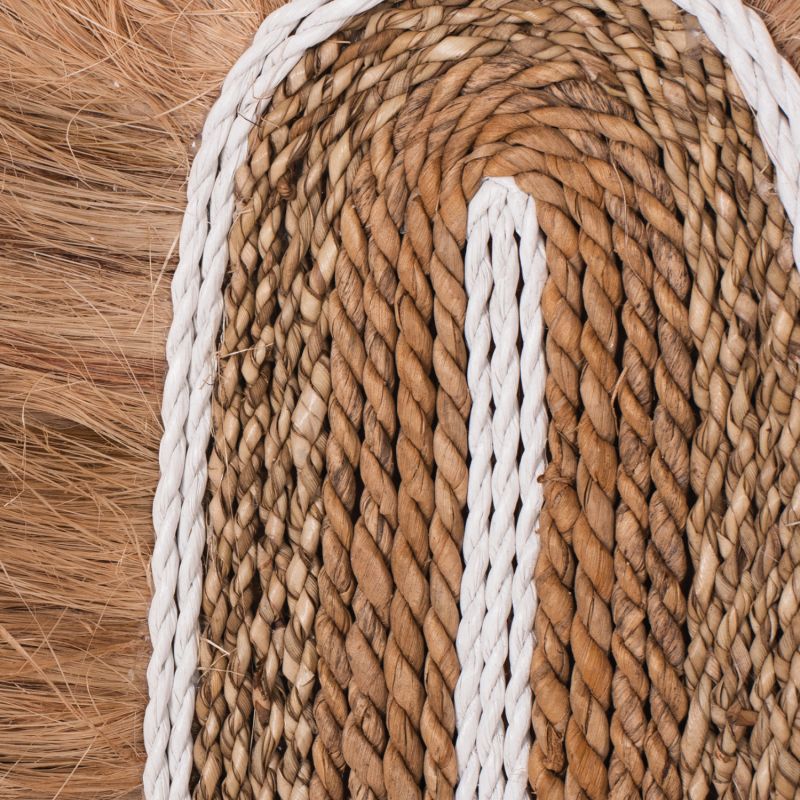 This wall decoration is made of grass with abaca fibers and rope. Manila hemp, also known as abaca, is a type of buff-colored fiber obtained from Musa textilis (a relative of edible bananas), which is likewise called Manila hemp as well as abaca. Abaca is an exceptionally strong fiber, very expensive, and priced several times higher than wood pulp. The name refers to the capital of the Philippines, one of the main producers of Manila hemp. Growing abaca plants can reduce erosion, increase biodiversity, and enrich the soil. Finally, it is water and moisture resistant.