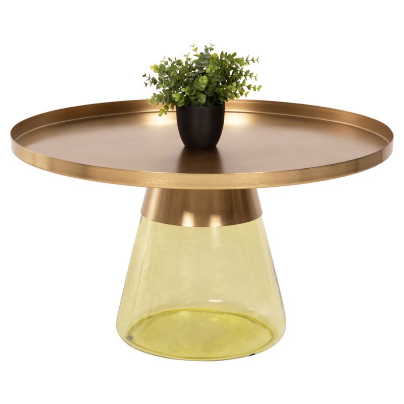 Discover the excellent coffee table “SCAL”. It is round with a glass cone-shaped base in a transparent GREEN color and a metal "neck" and top in a glossy GOLD color. This coffee table gives a sense of luxury, and it is ideal for both home and business spaces.