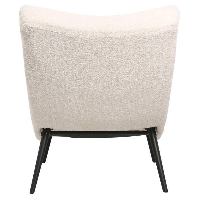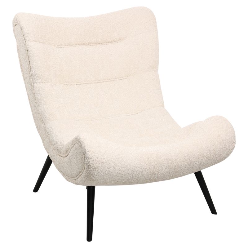 This is the BRYM armchair in ECRU color with black wooden legs. It has no arms and its design with permanent recline and high back makes it extremely comfortable. The boucle lining fabric offers a warm feel you'll love!
