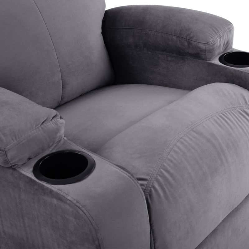ΗΜ0122.10 with GREY velvet upholstery, is an armchair that is the dream of many. Visually, it fills everyone's senses with its rich dimensions and comfortable cushions. The backrest is high while the seat is deep, and the arms invite you to spread your hands on their rich cushions. In addition, on top of both arms, there are built-in cup-holders, so you don't have to worry about where to put your coffee or drink. And when you come home from work and want to relax in front of your TV, or read your newspaper, or your favorite book in front of the window, then the relax mechanism lowers the back and in combination with the folding footrest will offer you unique moments of relaxation.