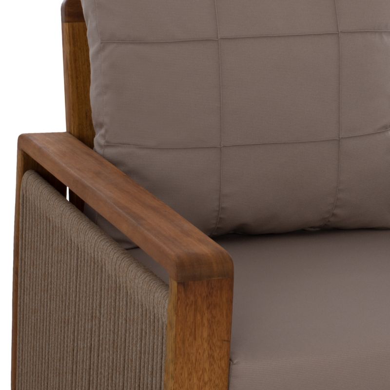 HΜ5877.01---We present to you the impressive and new handmade outdoor set in WALNUT color, with a coffee table, 2 armchairs and 1 three-seater sofa. A set that you will love at first sight. The beautiful table is entirely made of IROKO wood. The armchairs are equally impressive. The rope that is present on their sides is beautiful to look at while their sturdiness is evident thanks to the wide square bases whose upper part forms the arms of these armchairs. Their seat is wide while their back has a slight inclination towards the back which enhances the comfort they offer, in combination with the comfortable cushions on both the seat and the back. The three-seater sofa in a similar design is, however, the most impressive piece of this set with its large dimensions that make it the reference point. The cushions throughout the set are covered with quality fabric in BEIGE color and are filled with medium hardness foam materials for maximum comfort. What more could anyone ask for to upgrade their garden, balcony, or backyard?