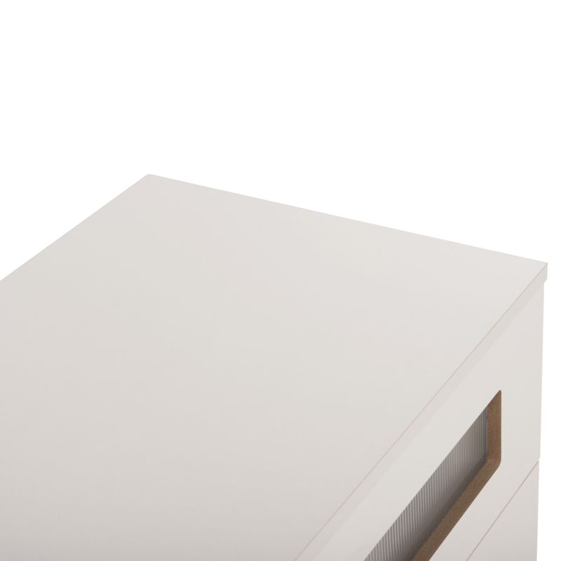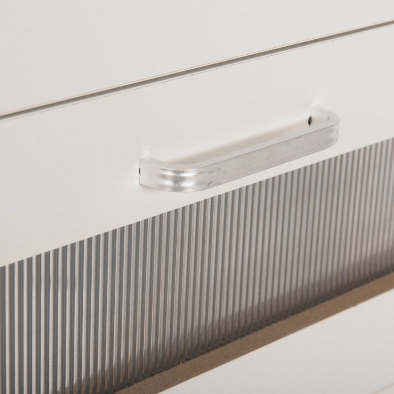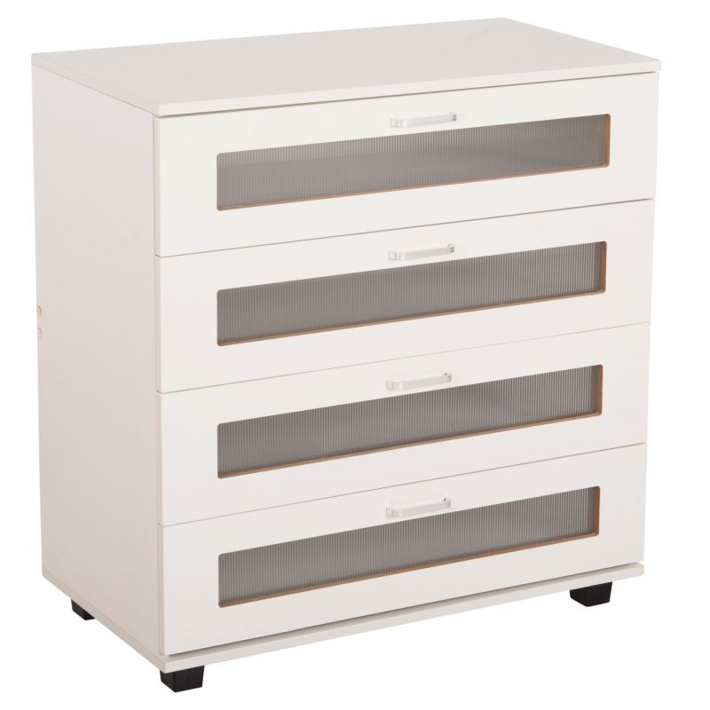 THORGAN is a large chest of drawers with 4 wide drawers that will satisfy all your needs. It has a neutral WHITE color with silver tone handles. The feature that makes this chest of drawers stand out is that the drawers have translucent polycarbonate glass windows. The black legs of the chest of drawers are stable and wide, offering robustness to the construction and at the same time create a pleasant two-tone color with the main body of the chest of drawers.