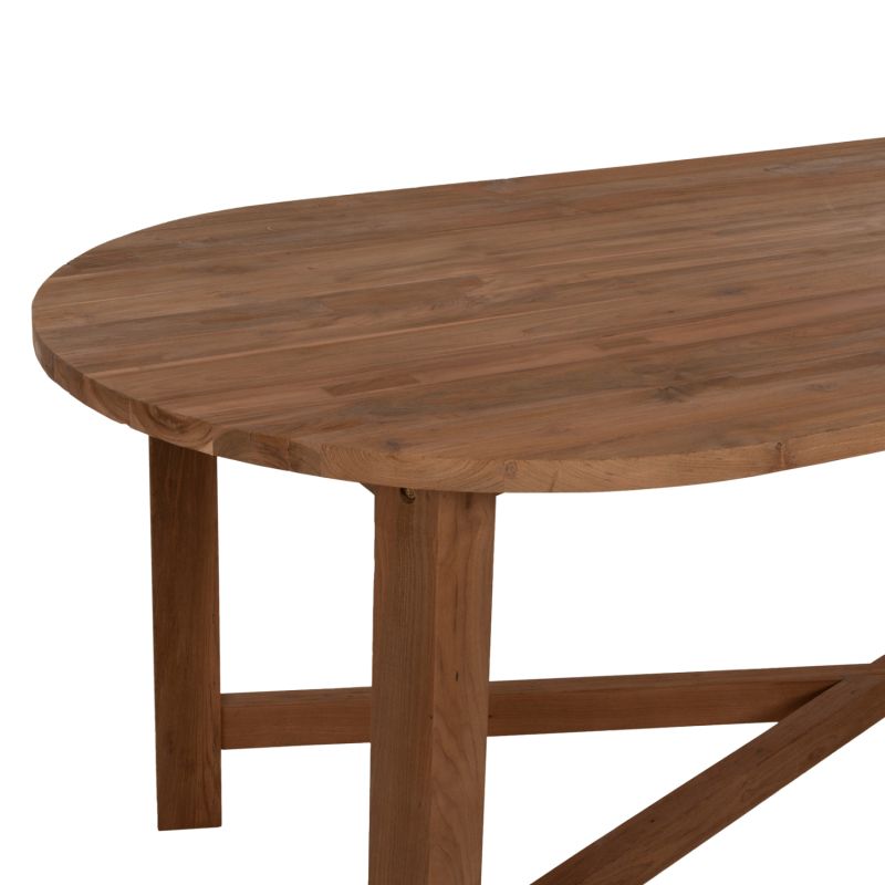 KUTAI is a large oblong table with rounded corners, made entirely of solid ΤΕΑΚ wood in its natural color. The 4 legs are particularly sturdy and are connected with wood in an X arrangement. A table that will upgrade your dining space and will delight everyone with its size and durability. Together with the corresponding benches, or chairs or armchairs, it allows you to create a beautiful set to enjoy your time with your family or friends.