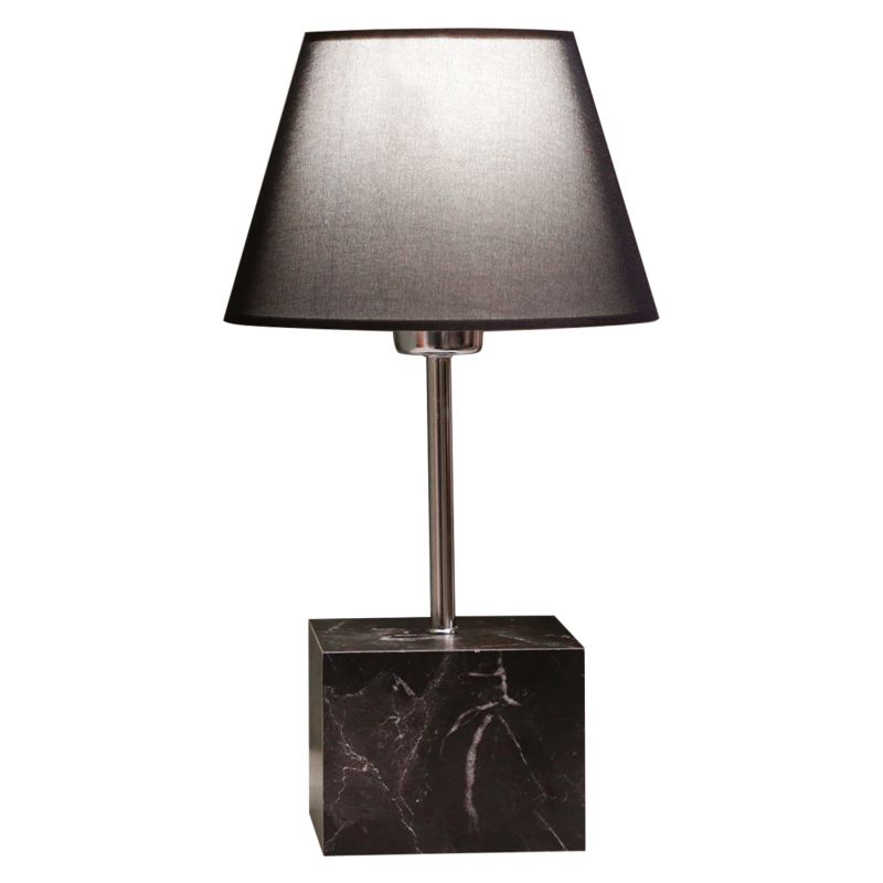 Decorative table lamp with single pillar. The base of the luminaire has the shape of a cube with the appearance of charcoal-grey marble while the pillar is in gold color. The "cap" has a trapezoidal circular shape in black color. The light diffuses pleasantly in space and its reflection on the golden pillar of the luminaire and the cubic base, plays pleasantly with your eyes. These types of luminaires are not intended for reading and this should always be taken into account when choosing one. They are purely decorative and their matching with the surrounding area should be harmonious. This lamp is elegant and convenient in dimensions, providing countless possibilities to "tie" with the rest of your decoration. It is a small work of art.