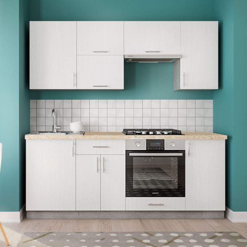 The main construction material of the kitchen is excellent quality melamine with a thickness of 16mm. Melamine is a type of wood in chipboard form. Chipboards are products that have the form of a panel and come from the welding, through pressing, of small pieces of wood (usually fir, beech, spruce, etc.) with the help of various resinous liquids. The chipboard is then coated, usually with synthetic materials such as hard paper sheets (melamines). As a material it is very durable and with great hardness. So, it is a synthetic material with a very hard surface, making it very resistant to scratches, abrasion, and stains.