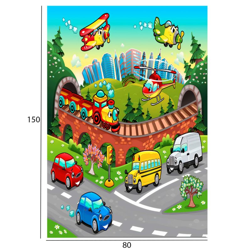This beautiful rug is colorful and has no border. The design of the carpet is an image that refers to cartoons with cars, trains, airplanes, and helicopters. Surely this carpet will indulge the child to spend endless hours playing on it. After all, the children's imagination will easily complete the "script" of the carpet!