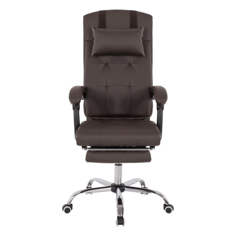 ΗΜ1057.19-- Executive office chair in BROWN color. A "rich" and imposing office chair with comfortable, ergonomically inclined armrests upholstered with cushions. The backrest is very high while it has a rich layer of foam materials and an extra cushion on the upper part of the backrest for greater comfort during use. It supports your entire torso, while it is upholstered with high-quality PU leather with a quilted technique, as well as the wide and comfortable seat with the extra comfortable surface. The base is chrome-plated in the shape of a "star" with curved legs and black and white caster wheels. The feature, however, that makes this chair stand out is that it has a folding footrest, which combined with the fact that the backrest "falls" with a great inclination, allows you to lie down and rest when you want!