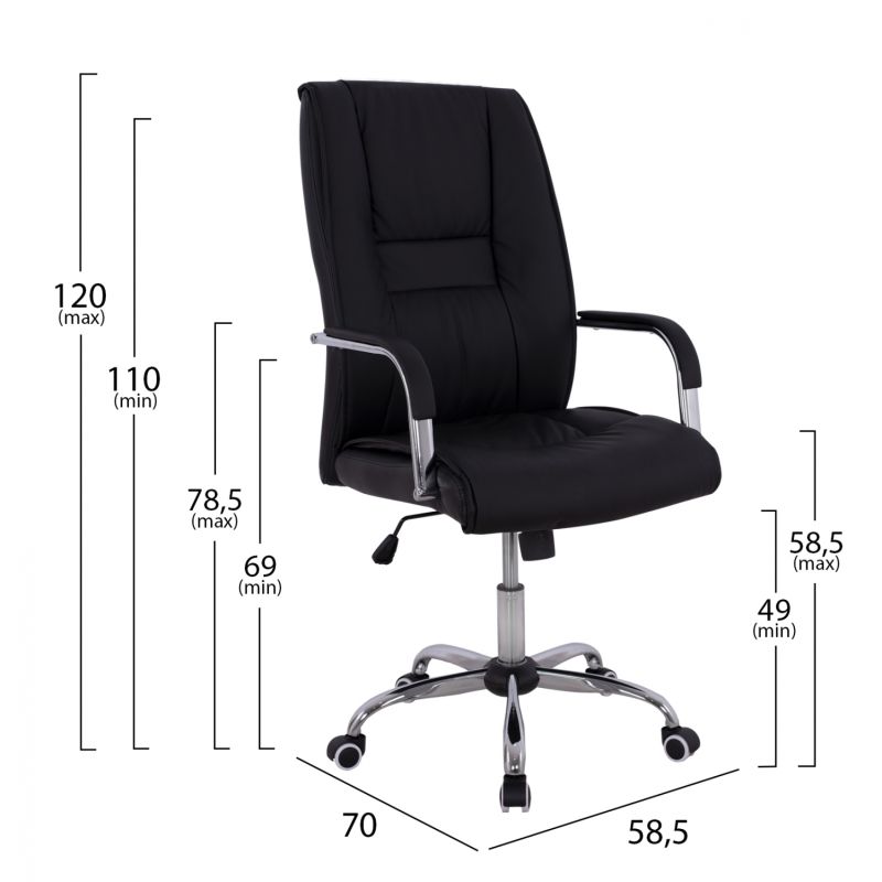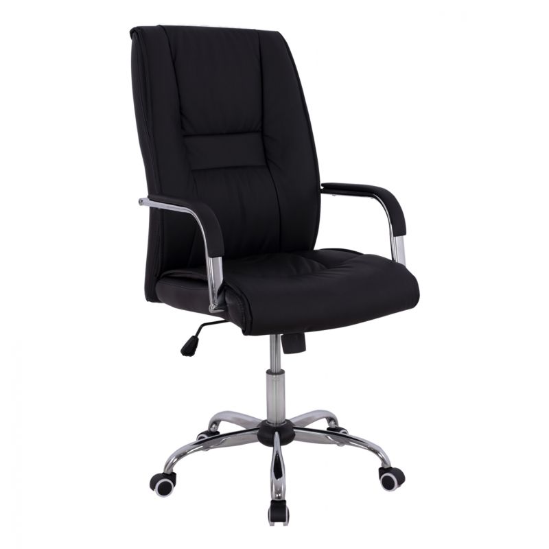 Executive office chair "ANGEE" in black color. A "rich" office chair with high straight arms upholstered in a thin layer of PU leather. The backrest is high with a rich layer of foam materials for comfort during use and supports your entire torso, while it is upholstered with high quality PU leather, as well as the wide and comfortable seat with the comfortable extra surface. The base is chrome-plated in the shape of a "star" with curved legs and black wheels.