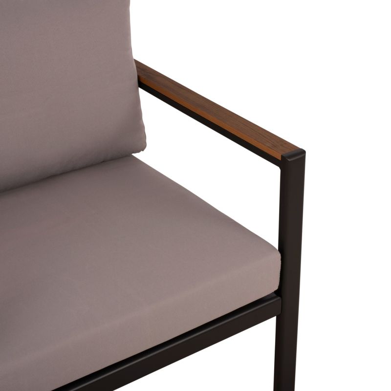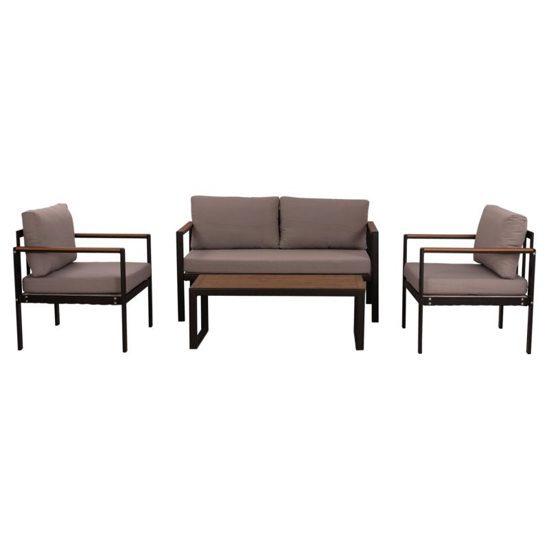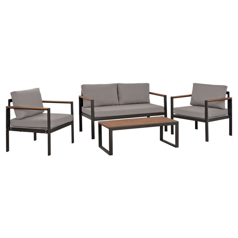 A two-seater sofa, two armchairs with fabric pillows and an aluminum table with polywood surface.