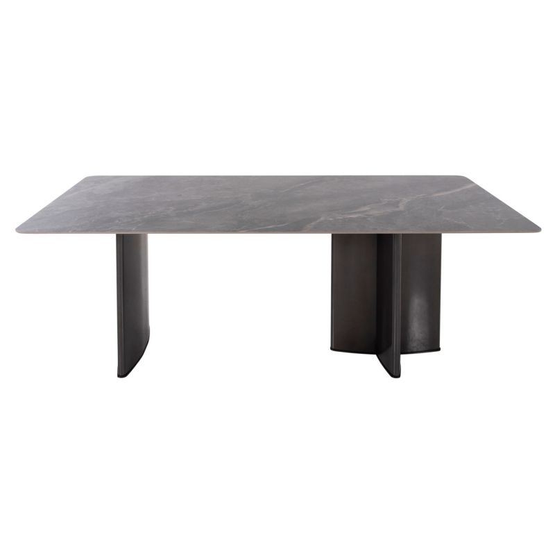 HEFF is a large dining table in a rectangular shape. The tabletop is high-quality slate ceramic in BLACK MARBLE coloring, while the legs are metal in BLACK color. The characteristic feature on this table is that the legs have a different design between them, and the tabletop is first mounted on an MDF base and then the legs are mounted on this base. This particular table will be a point of reference in any dining or catering space, no matter where it is placed.