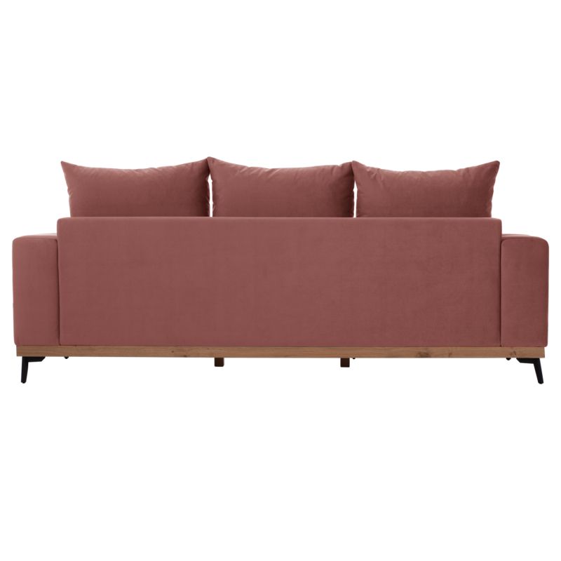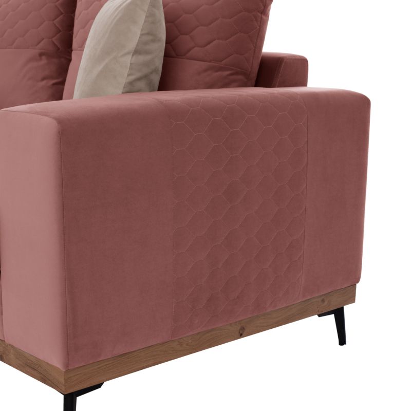 Starting with the basics and the obvious, the color of the velvety upholstery of the sofa is SAHARA 08- dusty pink. It has 3 back cushions in the same color and two smaller decorative cushions in SAHARA 03- ecru. The 2 large seat cushions combined with the back cushions give the perfect sense of comfort! The back cushions have a half-quilted style, and there is also a beautiful, quilted strip on the large arm. The cushions at their backside have a lighter gray color, while the two-tone coloring continues on the two small decorative cushions, as well.