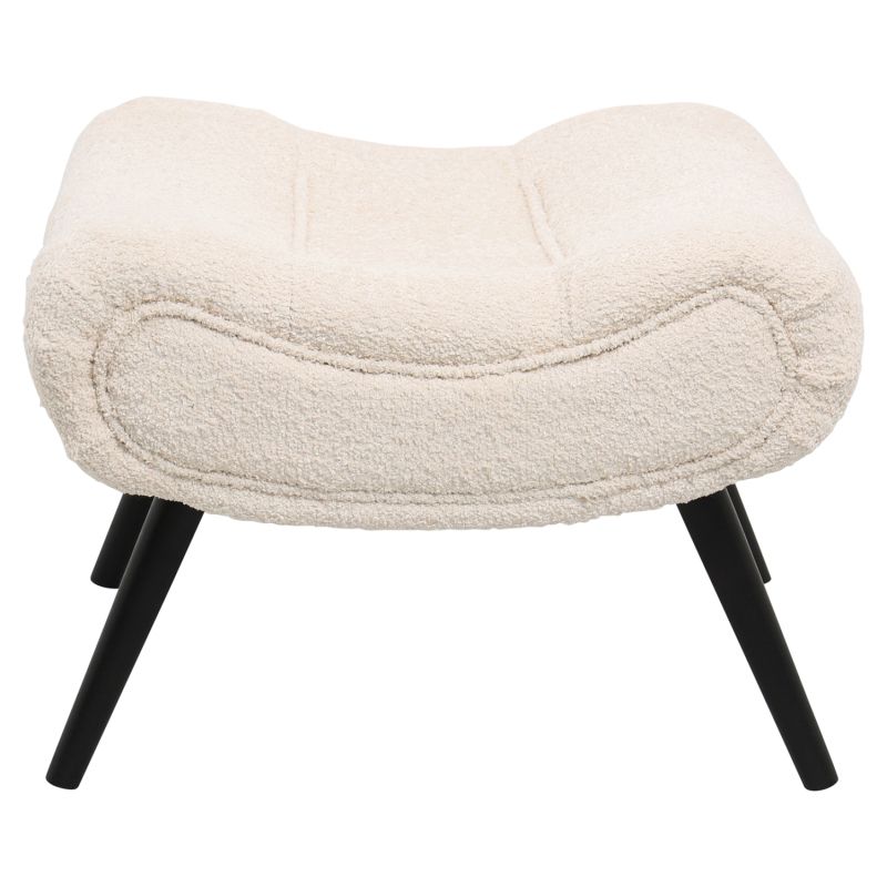 KEMBA stool-footrest upholstered in ECRU boucle warm fabric and black wooden legs.