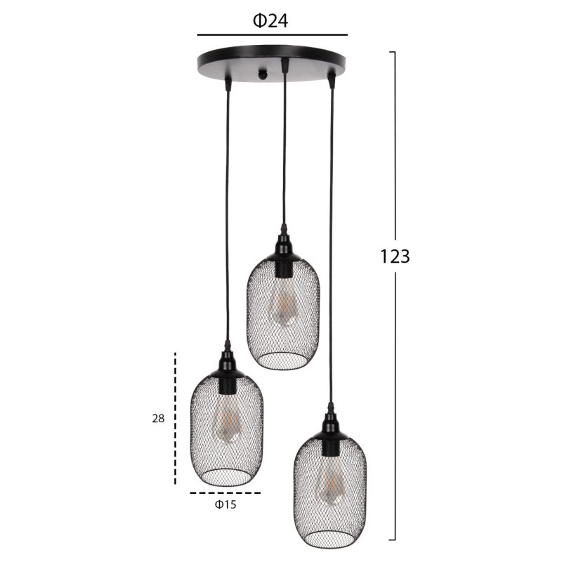 CEILING PENDANT LAMP HM4104 3-LIGHT BLACK METAL MESH CAPS Φ24x123Hcm.