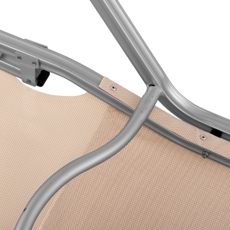 The lining of the sunbed has been made with waterproof reinforced textilene fabric (2X1- 600gr). This is a thick, strong, and durable polyester fabric. It means that it is made of polyester threads woven from edge to edge, and it is coated with PVC. The thread on this sunbed is 1300 D spec. (overnylon)