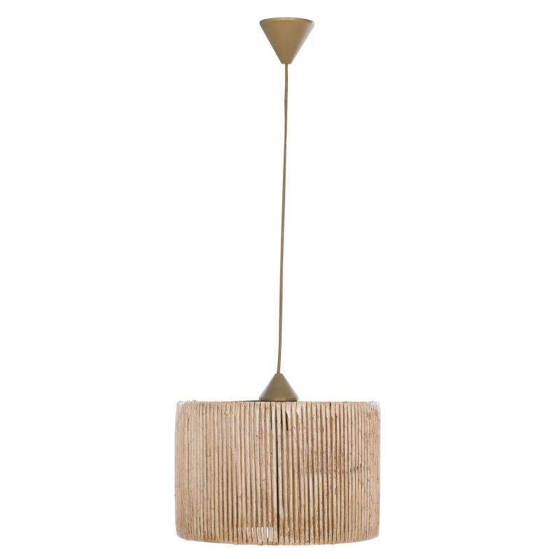 Μοντέρνο κρεμαστό φωτιστικό οροφής, κατασκευασμένο από ξύλινο σκελετό και επενδυμένο από bamboo υλικό σε φυσική απόχρωση.
