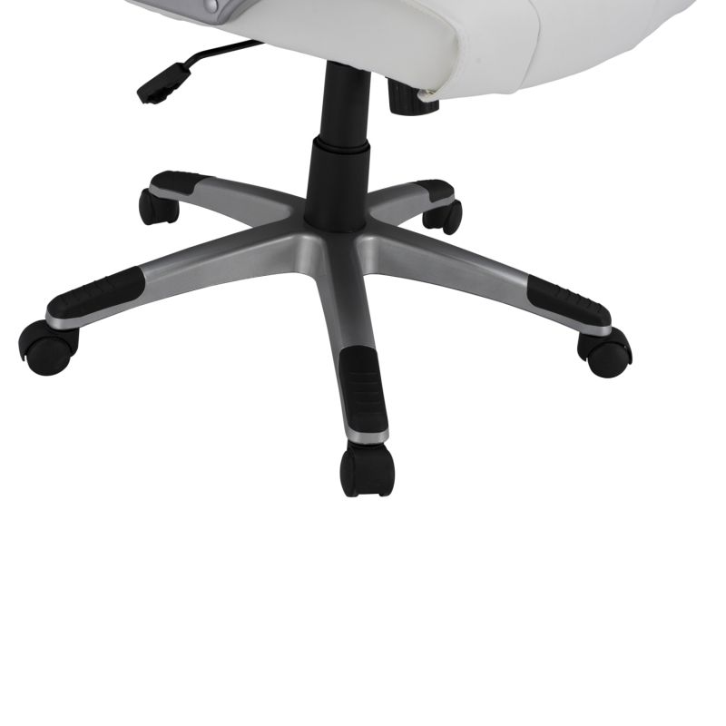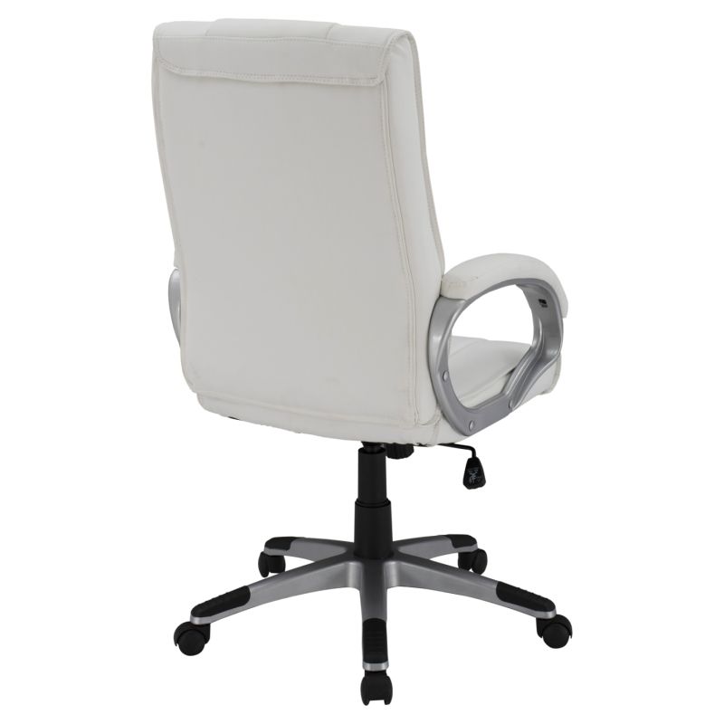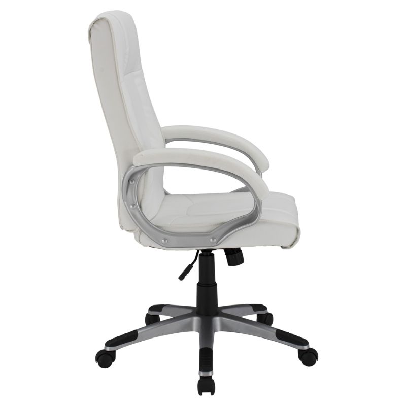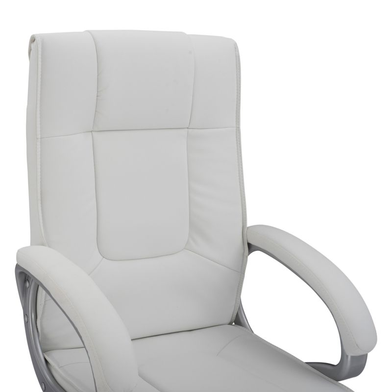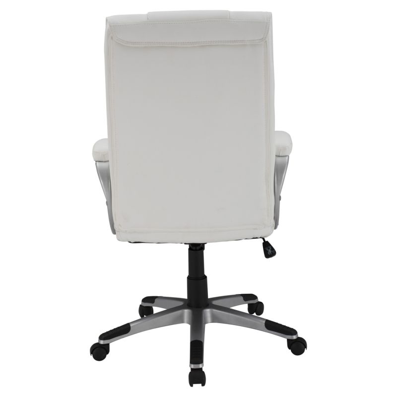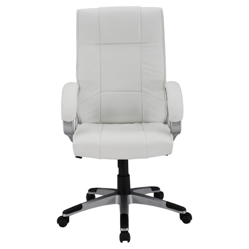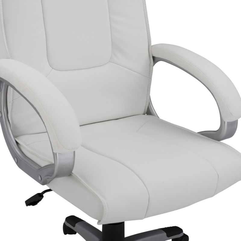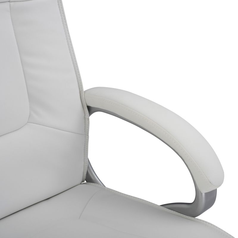 Executive office chair "CHANDER" in white. A "rich" office chair, with high sloping arms upholstered in a thin layer of foam in PU leather. The backrest is high with a rich layer of foam materials for comfort during use, and supports your entire torso, while it is upholstered with high quality PU leather, as well as the wide and comfortable seat with the comfortable surface. The base is matte silver in the shape of a "star" with black details on the “star” tips.