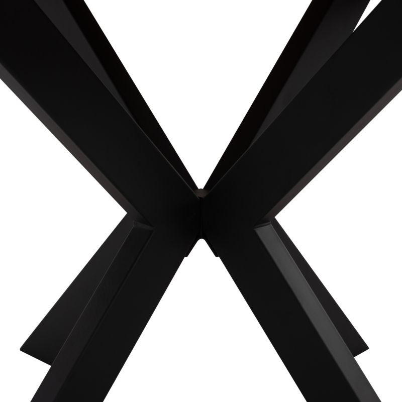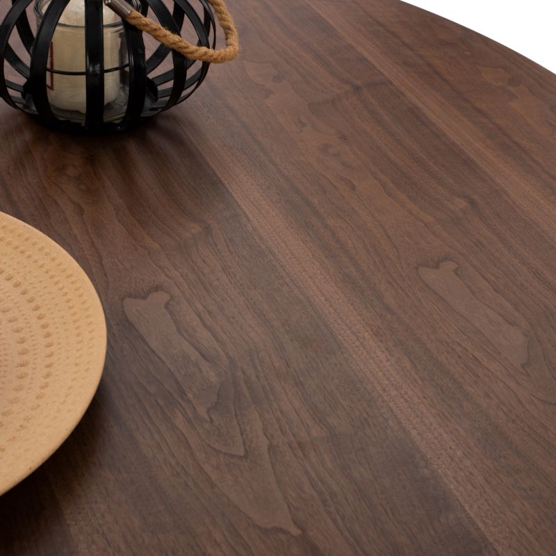 HΜ9310.02 is a round dining table, with MDF tabletop with walnut wood veneer in dark WALNUT color and rustic style. This surface rests on black metal double-cross legs. Round tables are particularly practical and beautiful because they do not have tops and "leaders", nor corners or legs that often create uncomfortable situations. It is a beautiful table in satisfactory dimensions and with a beautiful two-tone coloring, as a result of which it can fit aesthetically in almost any dining space.