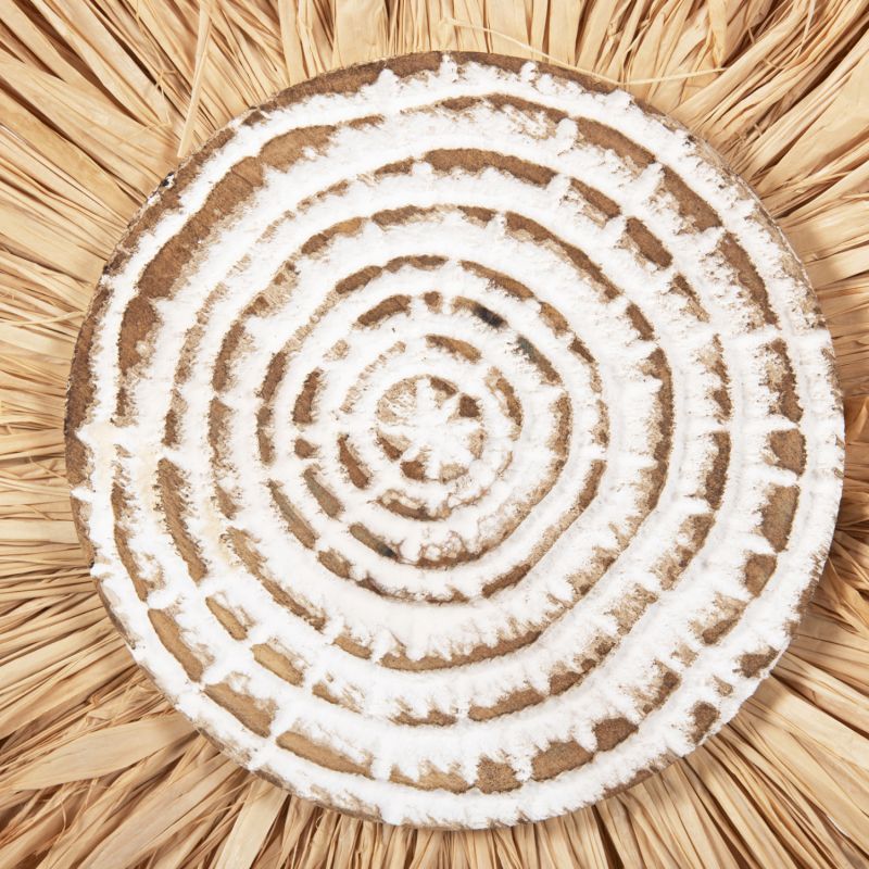 This table decoration in a round shape, is made of dried pieces of grass, placed on a black wooden base. Raffia fiber is obtained by peeling raffia palm leaves. Raffia palms are a genus of about twenty species of palms native to tropical regions of Africa, particularly Madagascar, with one species also occurring in Central and South America. Raffia fiber is soft, flexible, strong, and durable.