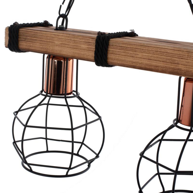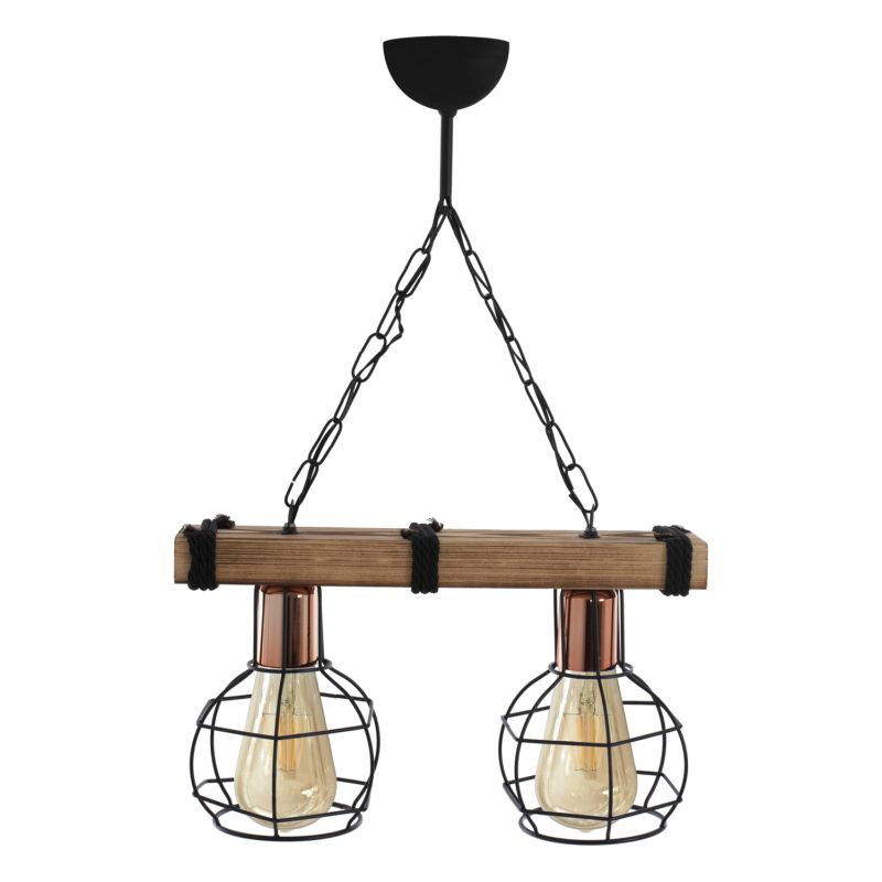 HM7681.01-Ceiling lamp-----This 2-light ceiling lamp uniquely combines rustic style with an industrial aesthetic conveyed by the black metal meshes of the lamps. The entire composition is suspended from the ceiling by a chain which initially holds a natural-colored wooden board in two points, under which the metal grids are assembled. This impressive lamp will give a completely different look to your space and will catch the eye!