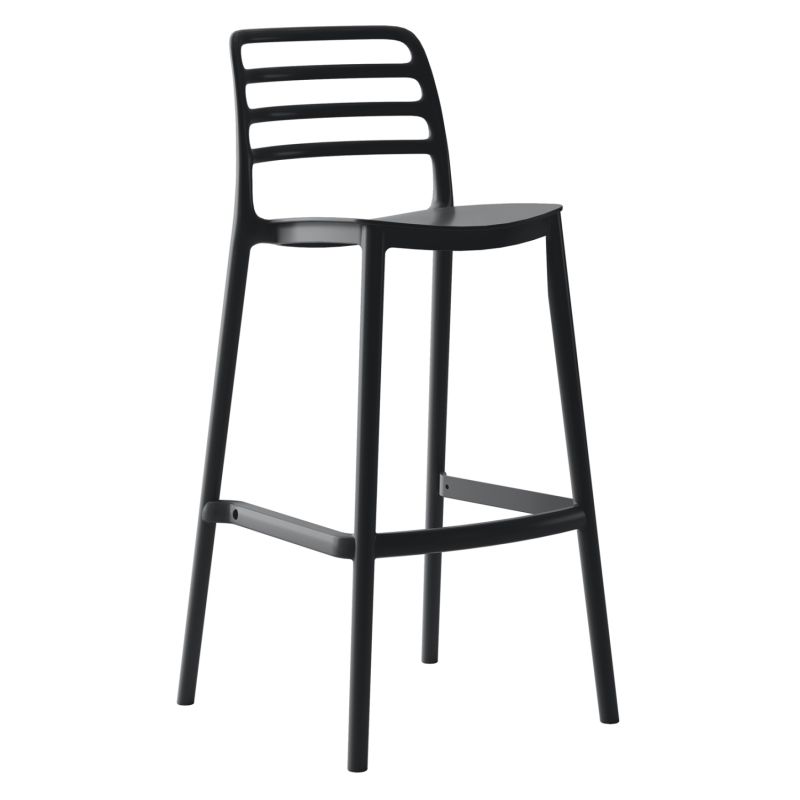 The SNOD stool is a simple bar stool that has everything you would want from such a piece of furniture. It's quality and elegant in appearance, and definitely an eye-catcher. The entire stool is made of one-piece polypropylene in BLACK color with a relatively low backrest with horizontal bars. Also, the legs are joined by a very practical footrest. The whole construction is light and comfortable, and it will become the favorite seat in any space thanks to its practicality, which is enhanced by the fact that the stool is also STACKABLE.