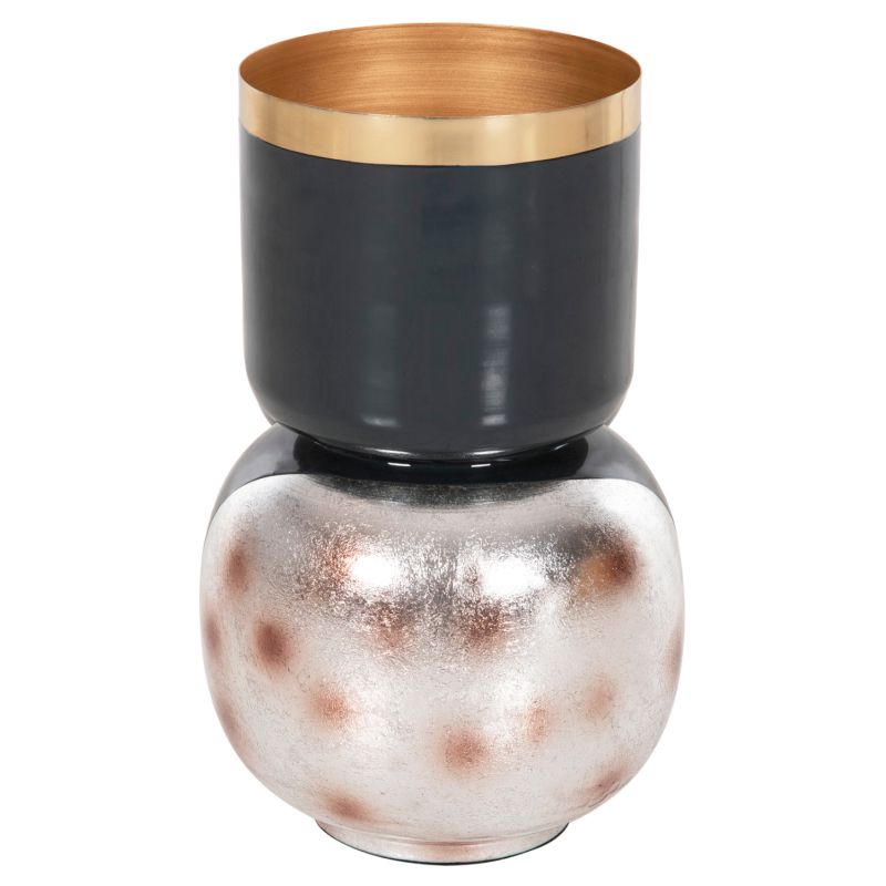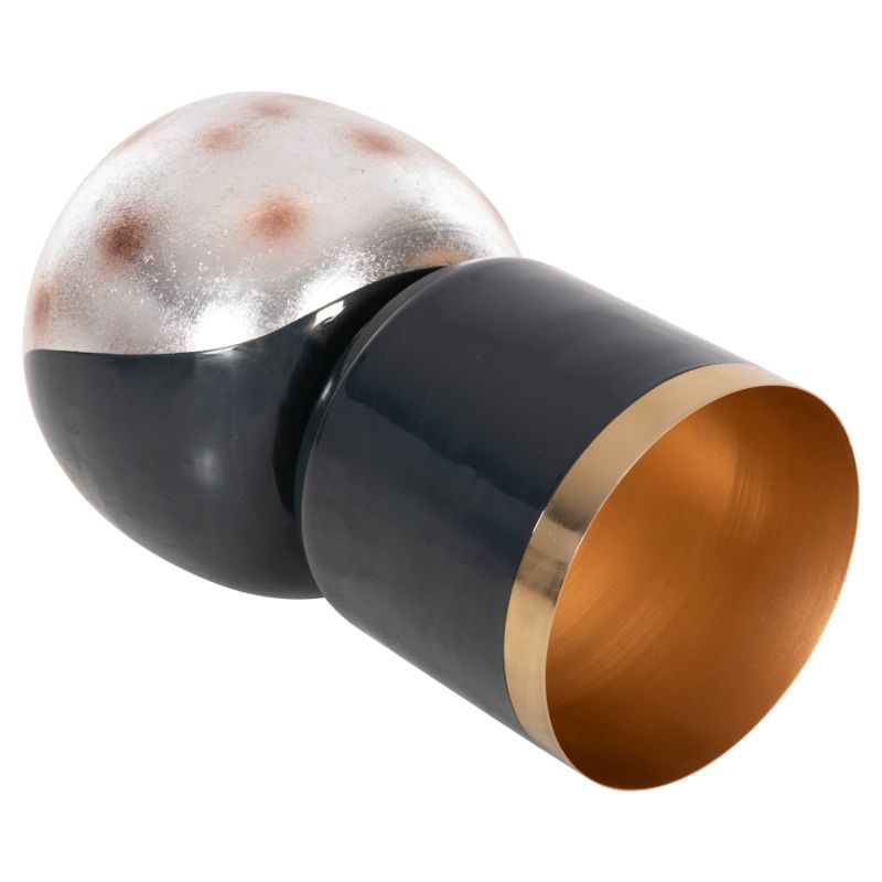 The LINGON decorative table vase is entirely metal and consists of two parts. The almost spherical base and the actual vase with the large rim, attached onto the base. Its color is ANTHRACITE BLUE with GOLD around the rim, while the base is ANTHRACITE BLUE with a brushed SILVER cloudy color with red dots. This vase will beautify any space whether at home or in your business.