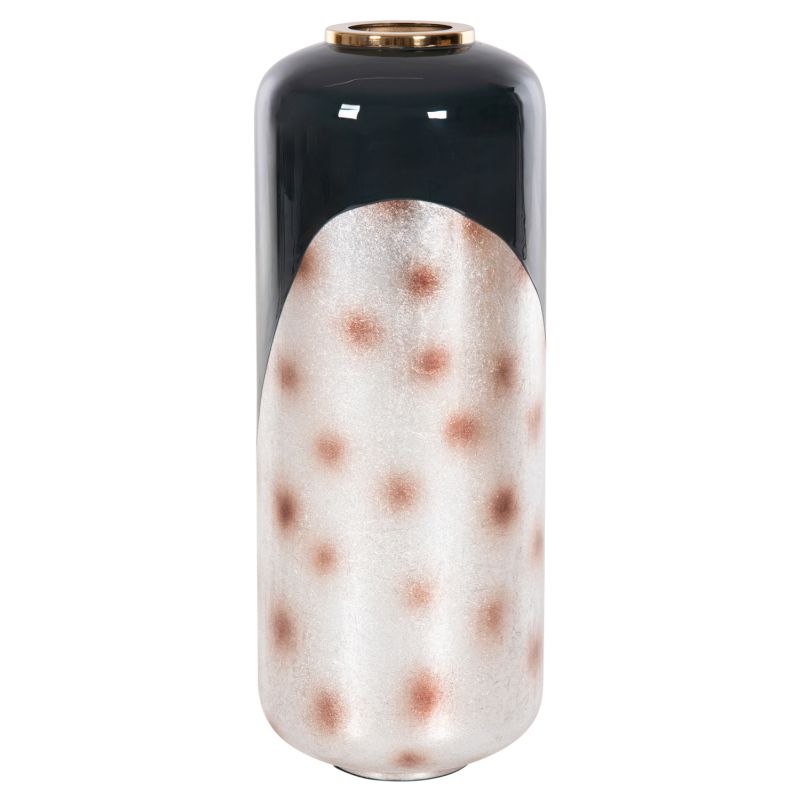 The tall and imposing decorative floor vase RAKSASA is entirely metal and will be a point of reference either at home or in professional spaces. Its color is ANTHRACITE BLUE and SILVER with blurred red dots.