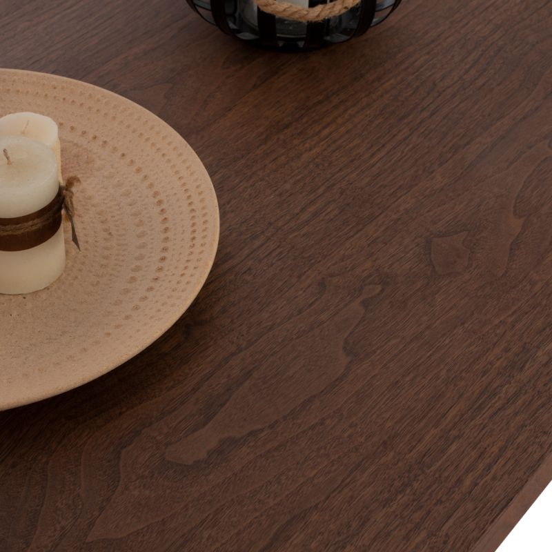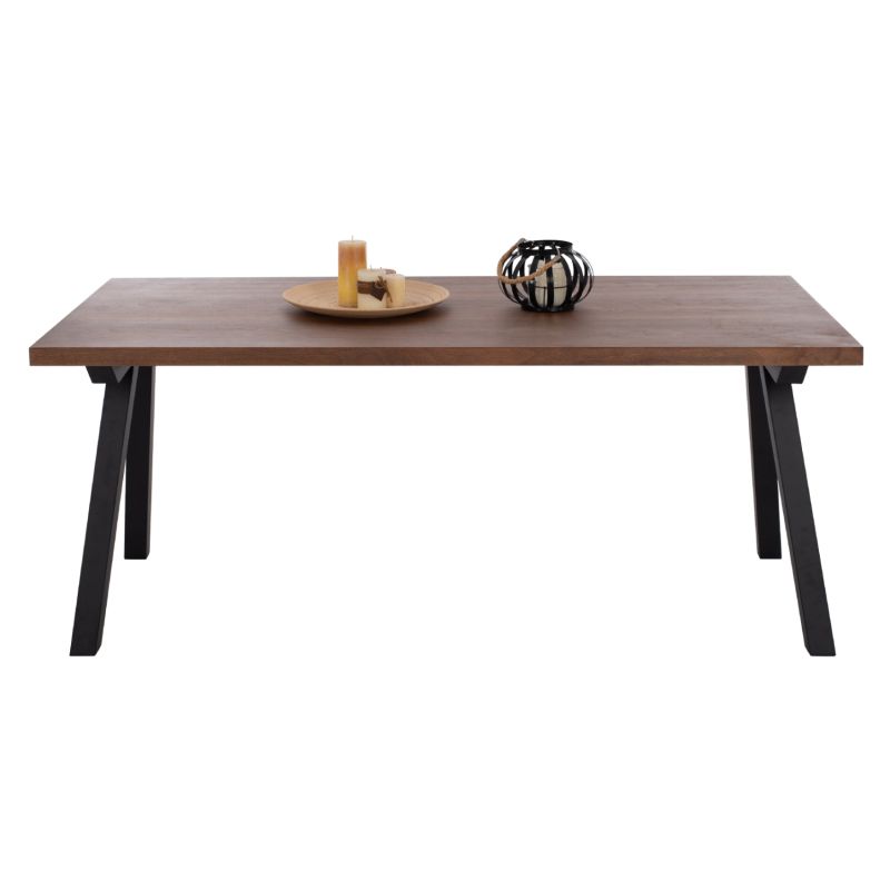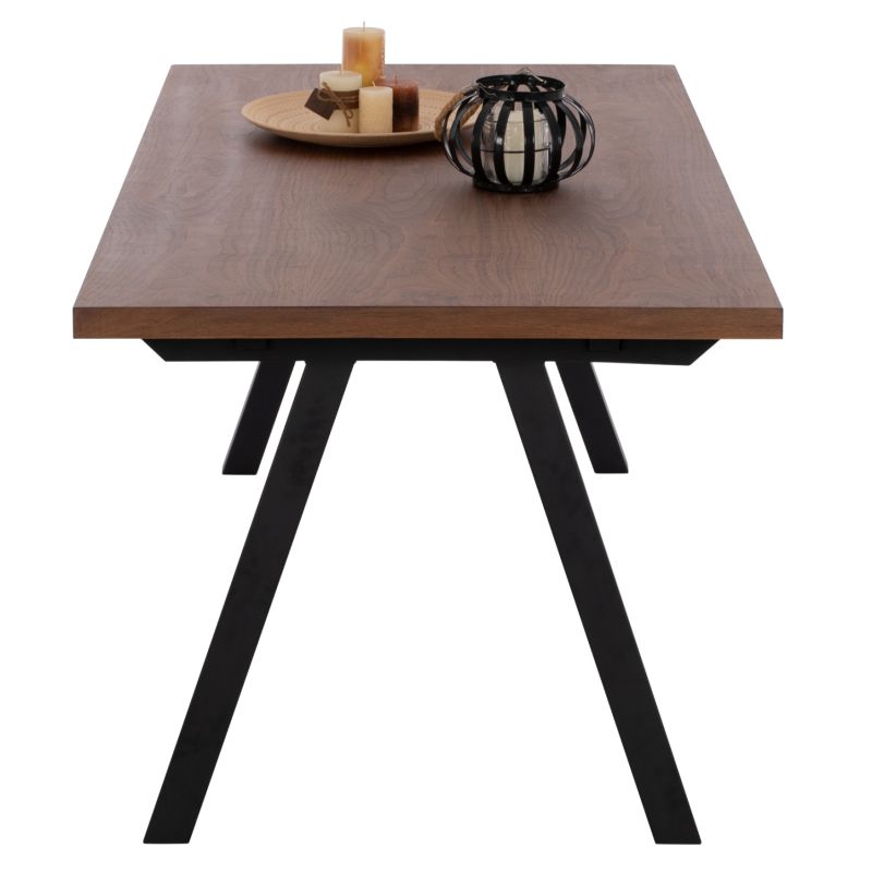 ARTI is a rectangular dining table, with MDF tabletop with walnut wood veneer in dark WALNUT color and rustic style. This surface rests on a black metal rectangular frame with legs in the shape of an open Λ. It is an imposing table in a large dimension and with a beautiful two-tone color, as a result of which it can fit aesthetically in almost any dining space.