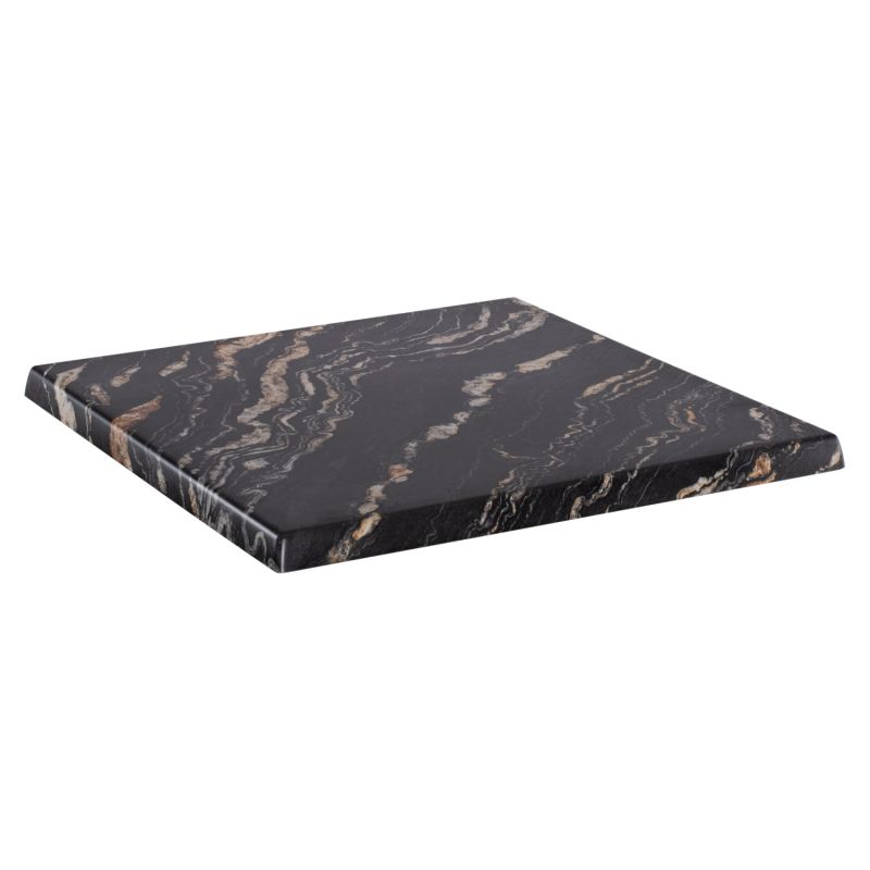 Professional SQUARE tabletop in BLACK GOLD marble color scheme, which is suitable for contact with food. In general, the material is environmentally friendly. It can be used in cafes, restaurants, and tourist accommodation, either indoors or outdoors.