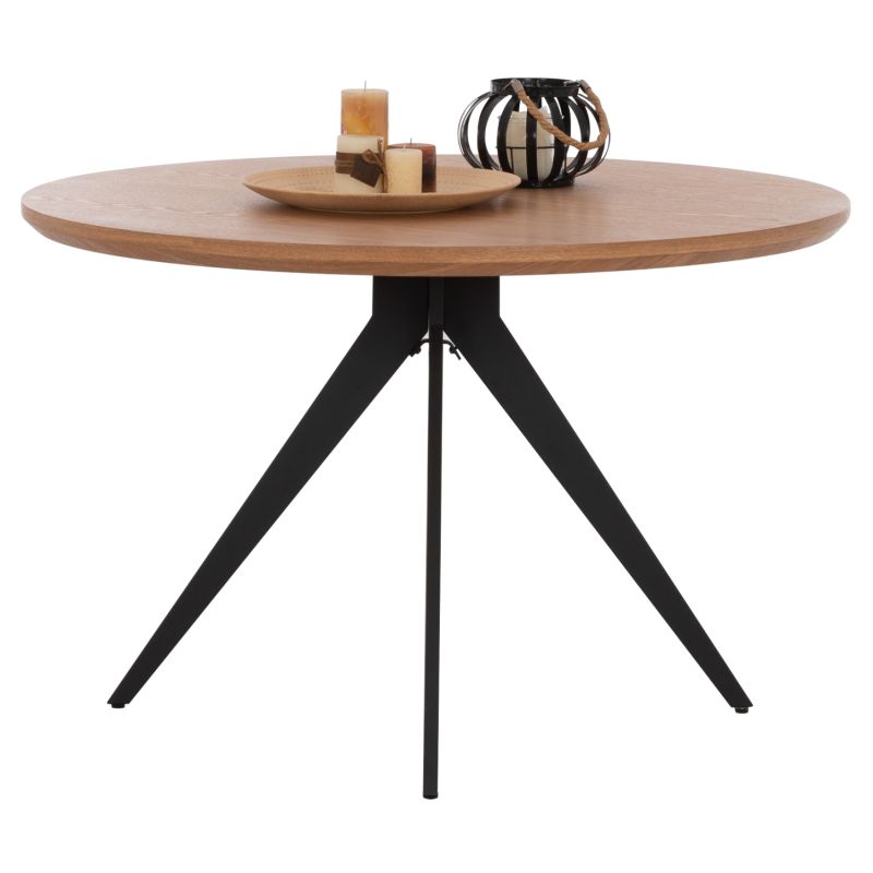 HΜ9307.01 is a round dining table, with MDF tabletop with oak wood veneer in HONEY OAK color and rustic style. This surface is slanted and rests on a black metal base with legs starting from the base in slanted Λ shape. Round tables are particularly practical and beautiful because they do not have tops and "leaders", nor corners or legs that often create uncomfortable situations. It is an imposing table in a large dimension and with a beautiful two-tone color, as a result of which it can fit aesthetically in almost any dining space.
