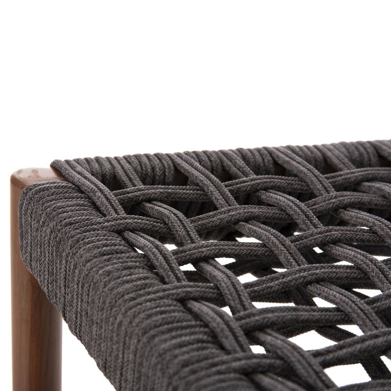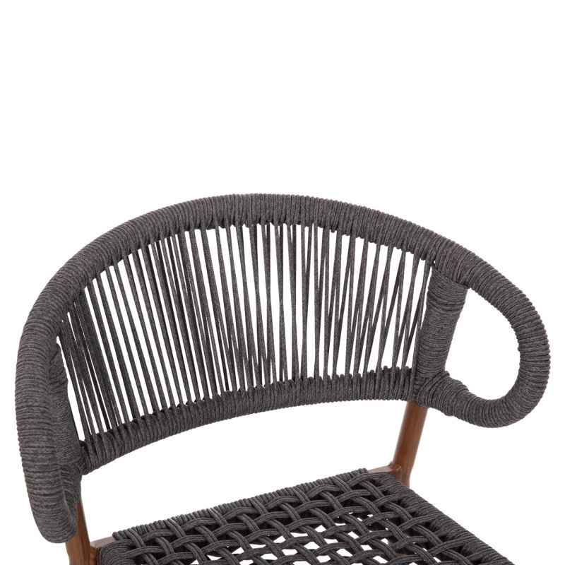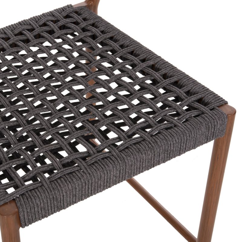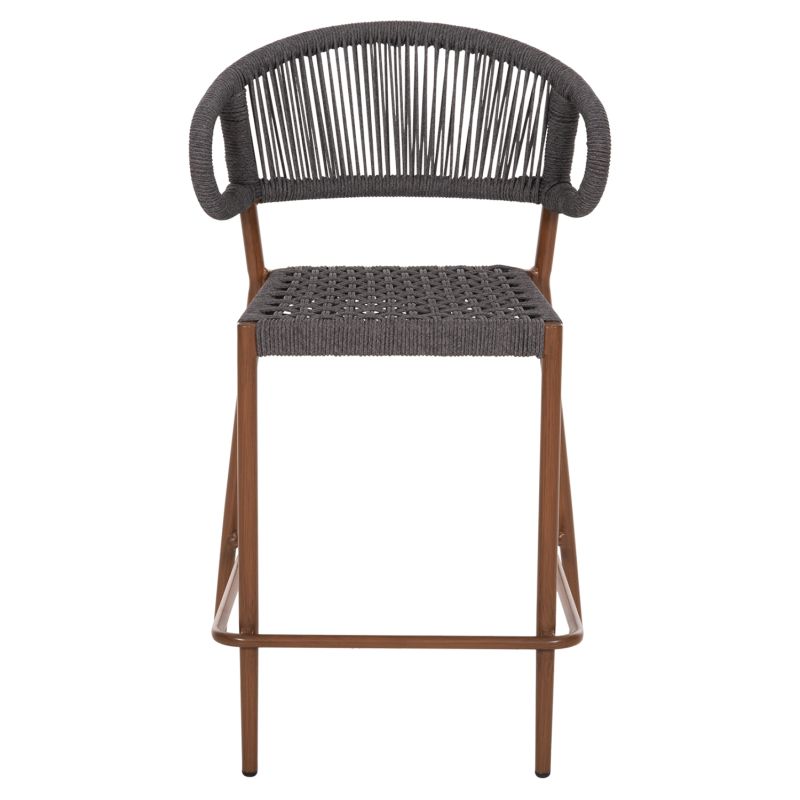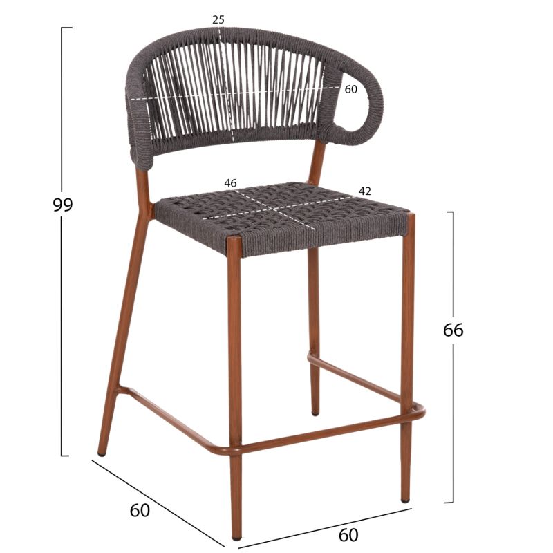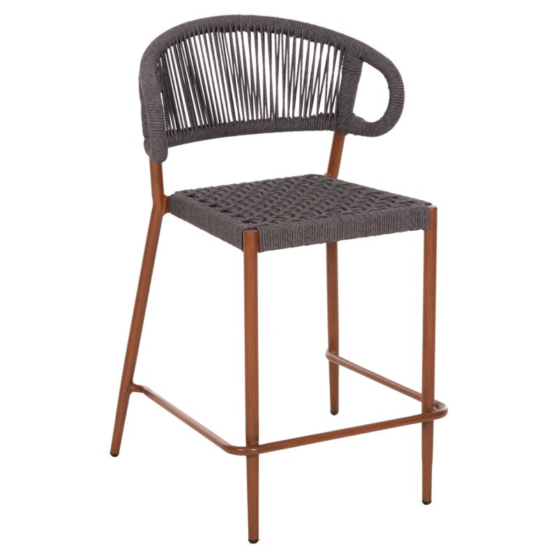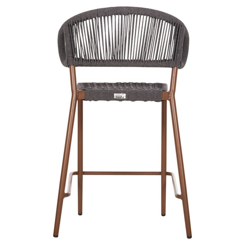 The EULO medium height aluminum bar stool is a new addition to our range. The frame is WALNUT (wood) in color and has a medium height and wide curved back and wide seat, made of GREY synthetic Rattan ("twisted" that looks like a rope). This stool is ideal for a multitude of outdoor uses.