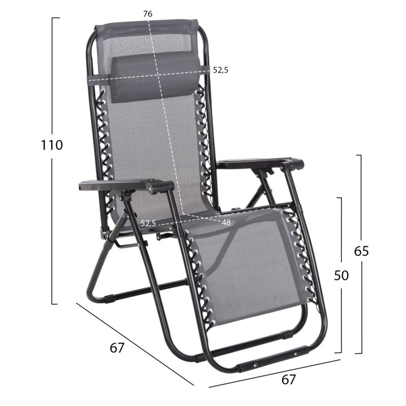 COMPANION is a multipurpose folding armchair that you will love! It has a metal frame in BLACK color and textilene in GREY color and has a full recline mechanism (relax) which means that the back "falls" almost completely and the "apron" (footrest) rises to create a bed in a way, and there is even a head cushion that perfectly complements the armchair. Its relatively low weight allows you to easily carry it anywhere you need it, from the beach to a hospital, as an attendant armchair.