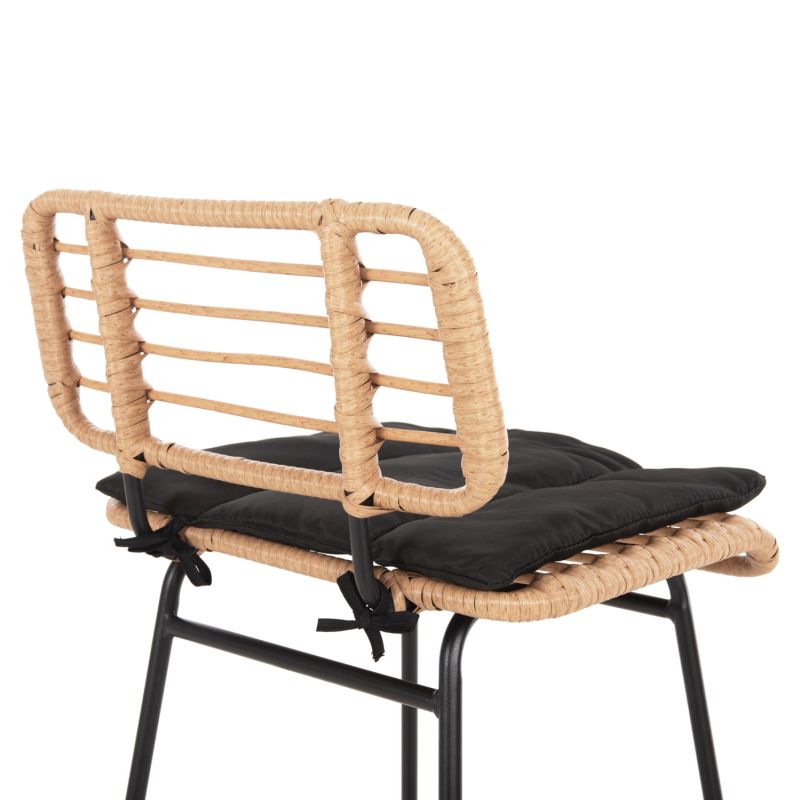 The ALLEGRA outdoor bar stool with a high seat is sturdy and beautiful! Its construction with Wicker synthetic Rattan in BEIGE color will aesthetically upgrade the space you put it and will catch the eye. It has a backrest and a black seat cushion that is attached to the chair with ropes, complementing it perfectly. The frame is metallic in BLACK color. The characteristic of this stool is that its backrest does not touch the seat and it is short.