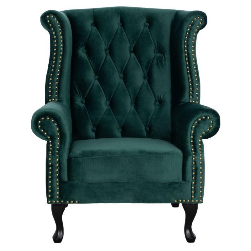 This is the Bergere HM0053.03 in CYPRESS GREEN color and wooden legs in black color. The feature that makes this armchair stand out is that its Chesterfield-style design gives it a sense of prestige and luxury wherever it is used. The main feature of this style is the lining with excellent quality velvety fabric, which on the backrest is in a deep quilted style, serving the Chesterfield style.