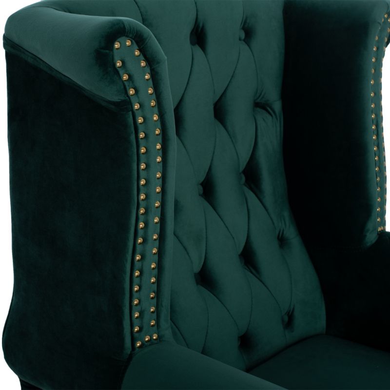 • Aesthetic excellence with the velvety cypress green Chesterfield-style, and natural-colored carved legs, which can be combined with various decorative patterns.
