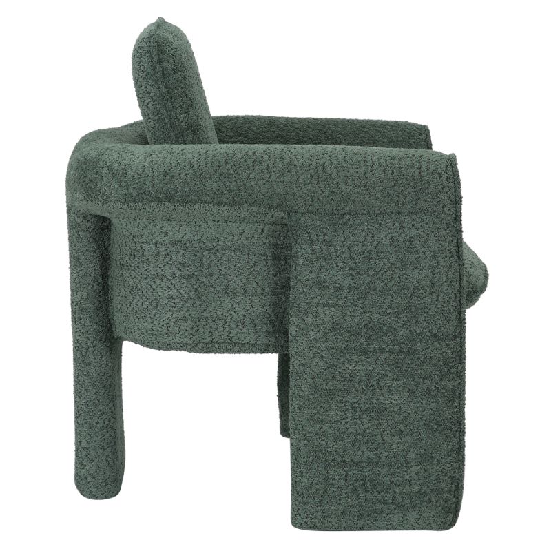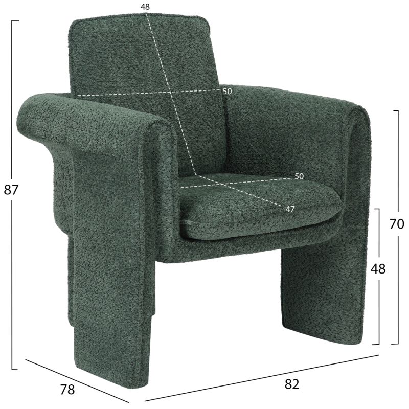 The frame of the armchair is powder coated metal, while the upholstery is made of excellent quality, boucle fabric. This is any fabric that has a knot-curl in its weave. It is made of almost all raw materials (although it is usually synthetic) with special knotted threads or highly twisted threads, so that it has a curly surface. It does not wrinkle and can be plain, melange, checkered or tweed.