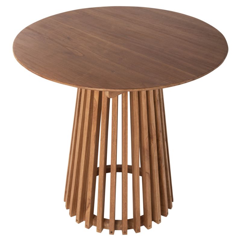FRANTZ is a round dining table, with satisfactory dimensions in a natural wood color. The tabletop rests on a wooden structure in the center with several beams in a cone-shaped arrangement joined together internally at the bottom. This table will aesthetically upgrade your kitchen or dining room while it can match many different styles and colors in the surrounding space. You can even choose from a wide range of different chairs to match with this table.
