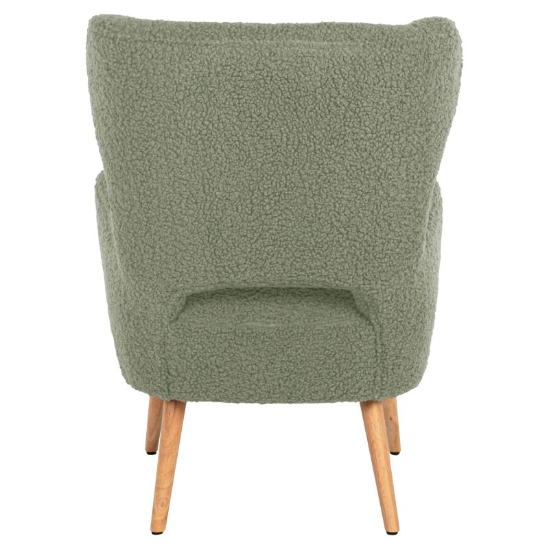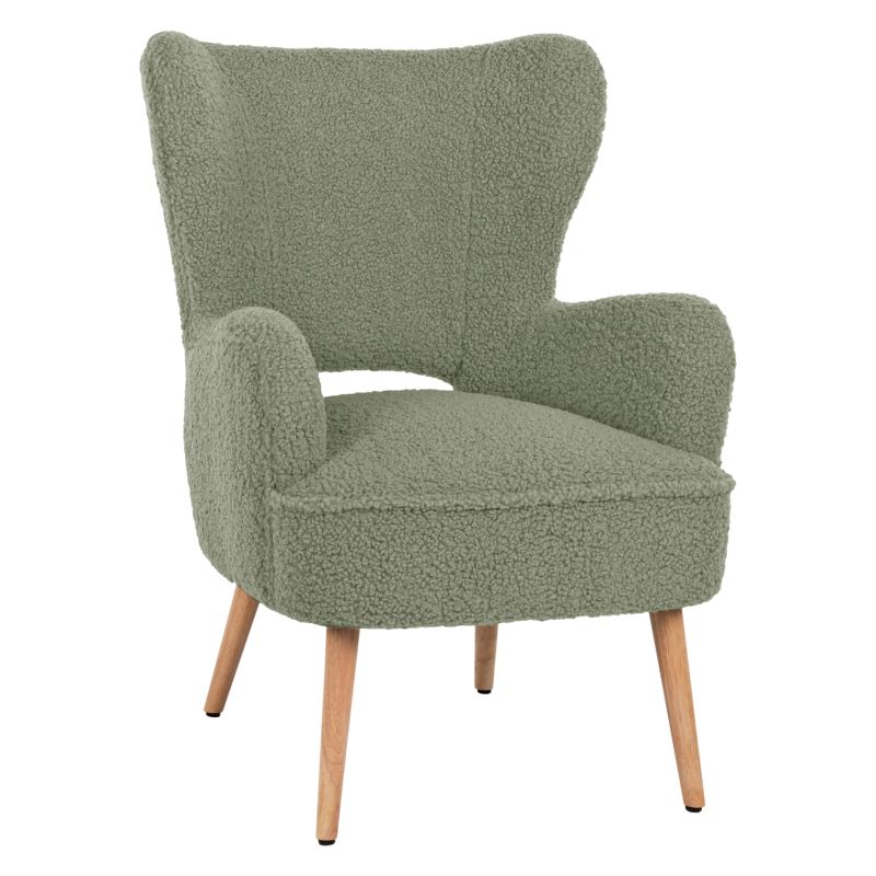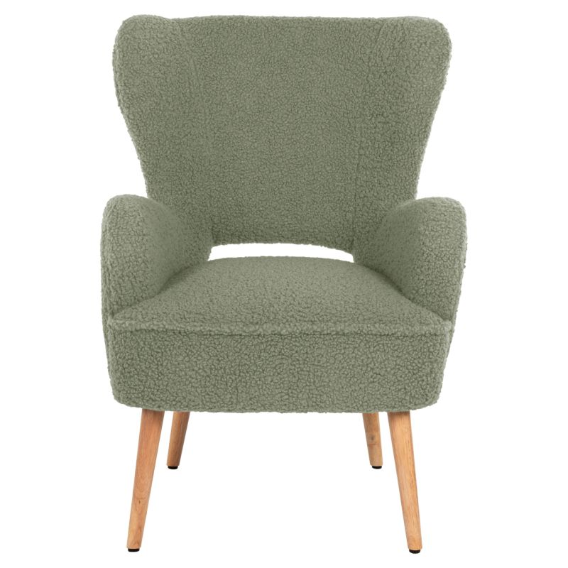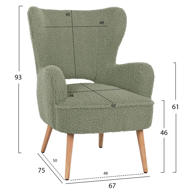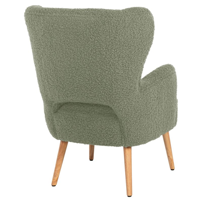 We present the MYLIE armchair-bergere, in PISTACHIO GREEN color with legs in natural wood color. The high backrest with a beautiful opening at the back, and its “bucket” design, give a special beauty to the armchair in combination, of course, with the high-quality boucle fabric. The seat is comfortable in response to the character of the armchair, while the characteristic of this armchair is that it sports strong curves both high on the back and on the arms. It is modern, combining style and comfort, and you can place it next to the fireplace, in a window or even in your bedroom, and let yourself be embraced by it.