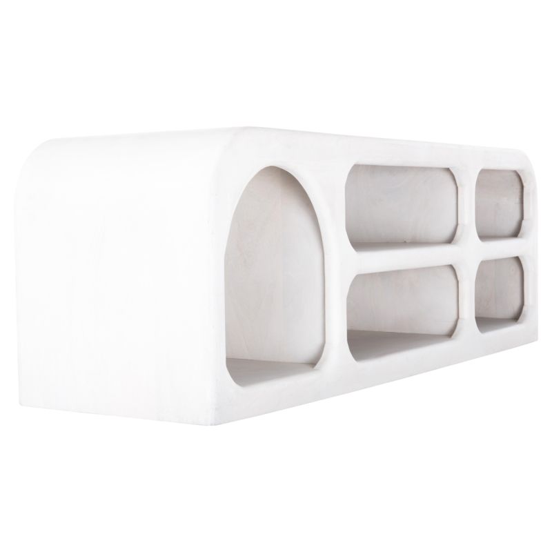 The “HANDYR” TV cabinet is entirely made of solid mango wood in WHITE color. The corners and edges are rounded while it has 5 open spaces for storing or placing items. Its surface length is satisfactory and will fit most TVs if you decide to place it on a stand rather than hanging it on the wall.